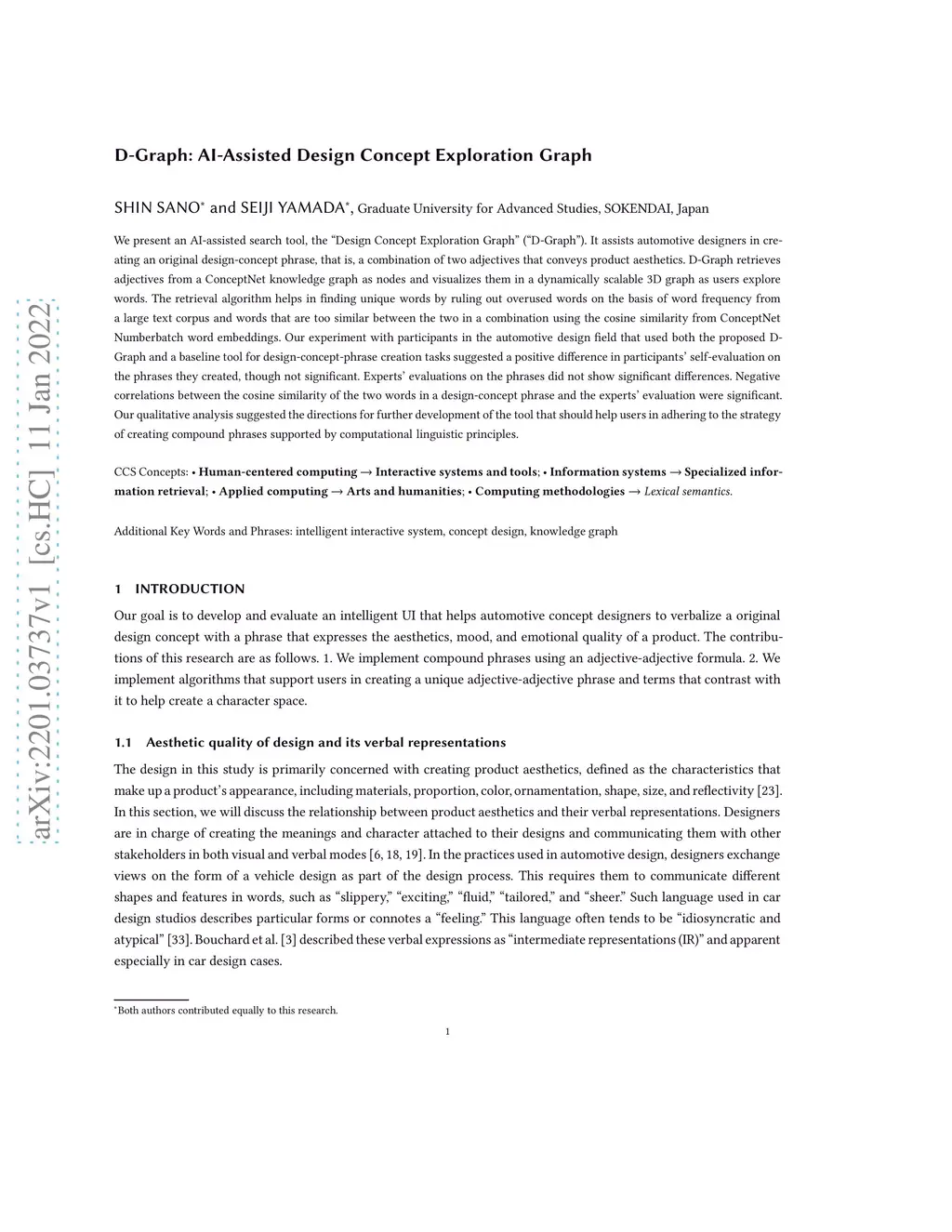 We present an AI-assisted search tool, the "Design Concept Exploration Graph" ("D-Graph"). It assists automotive designers in creating an original design-concept phrase, that is, a combination of two adjectives that conveys product aesthetics. D-Graph retrieves adjectives from a ConceptNet knowledge graph as nodes and visualizes them in a dynamically scalable 3D graph as users explore words. The retrieval algorithm helps in finding unique words by ruling out overused words on the basis of word frequency from a large text corpus and words that are too similar between the two in a combination using the cosine similarity from ConceptNet Numberbatch word embeddings. Our experiment with participants in the automotive design field that used both the proposed D-Graph and a baseline tool for design-concept-phrase creation tasks suggested a positive difference in participants' self-evaluation on the phrases they created, though not significant. Experts' evaluations on the phrases did not show significant differences. Negative correlations between the cosine similarity of the two words in a design-concept phrase and the experts' evaluation were significant. Our qualitative analysis suggested the directions for further development of the tool that should help users in adhering to the strategy of creating compound phrases supported by computational linguistic principles.