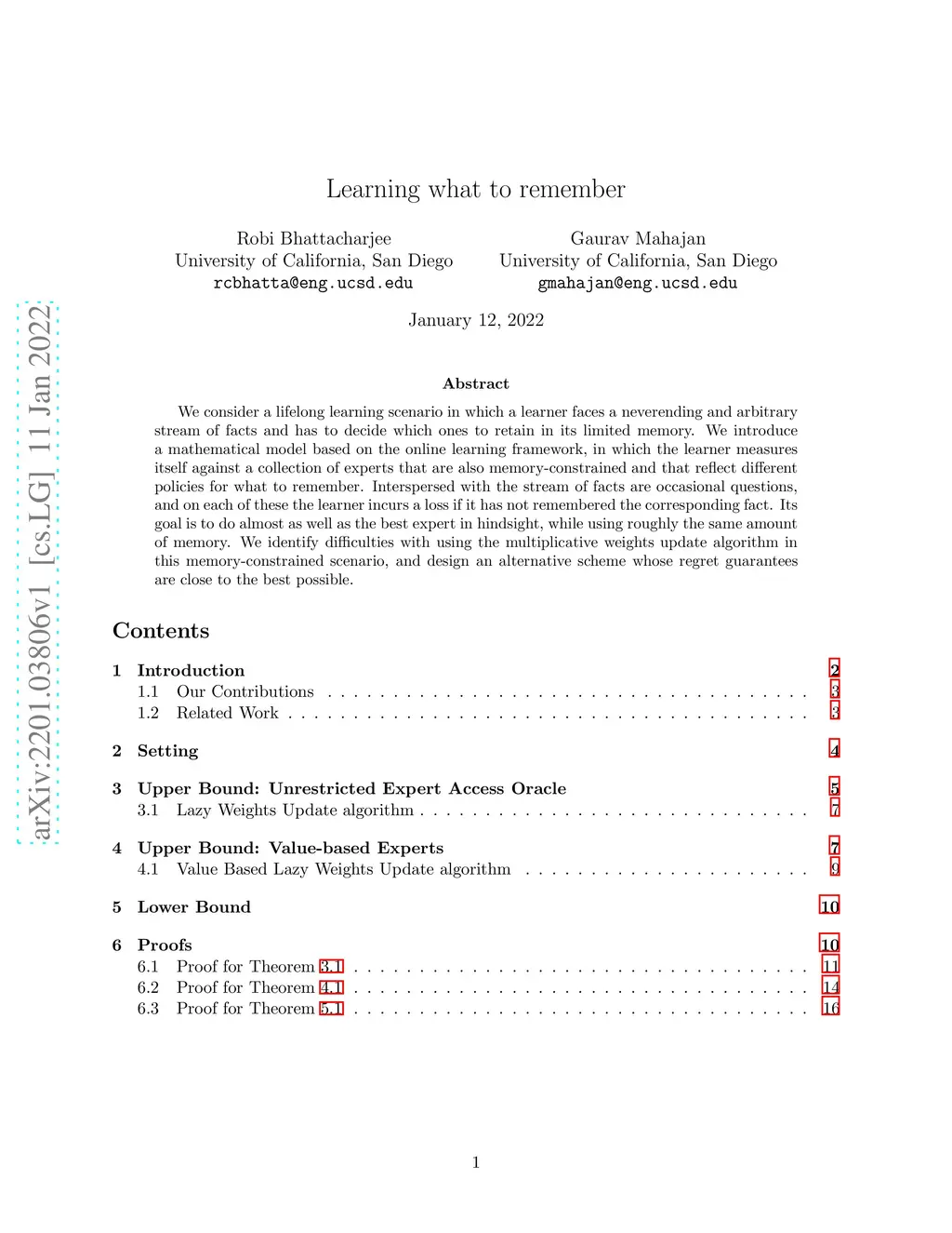 We consider a lifelong learning scenario in which a learner faces a neverending and arbitrary stream of facts and has to decide which ones to retain in its limited memory. We introduce a mathematical model based on the online learning framework, in which the learner measures itself against a collection of experts that are also memory-constrained and that reflect different policies for what to remember. Interspersed with the stream of facts are occasional questions, and on each of these the learner incurs a loss if it has not remembered the corresponding fact. Its goal is to do almost as well as the best expert in hindsight, while using roughly the same amount of memory. We identify difficulties with using the multiplicative weights update algorithm in this memory-constrained scenario, and design an alternative scheme whose regret guarantees are close to the best possible.