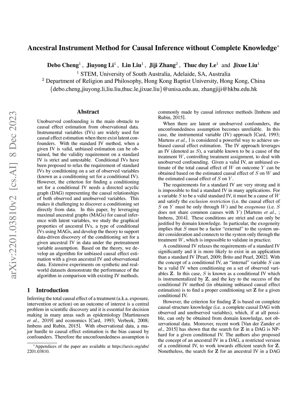 Ancestral Instrument Method for Causal Inference without Complete