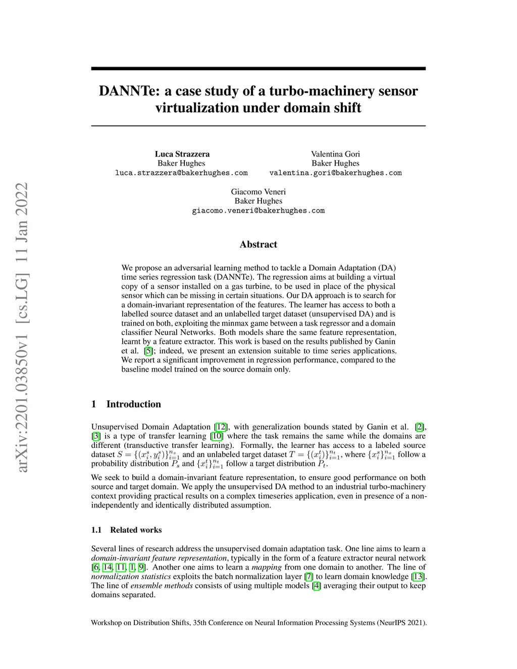We propose an adversarial learning method to tackle a Domain Adaptation (DA) time series regression task (DANNTe). The regression aims at building a virtual copy of a sensor installed on a gas turbine, to be used in place of the physical sensor which can be missing in certain situations. Our DA approach is to search for a domain-invariant representation of the features. The learner has access to both a labelled source dataset and an unlabeled target dataset (unsupervised DA) and is trained on both, exploiting the minmax game between a task regressor and a domain classifier Neural Networks. Both models share the same feature representation, learnt by a feature extractor. This work is based on the results published by Ganin et al. arXiv:1505.07818; indeed, we present an extension suitable to time series applications. We report a significant improvement in regression performance, compared to the baseline model trained on the source domain only.