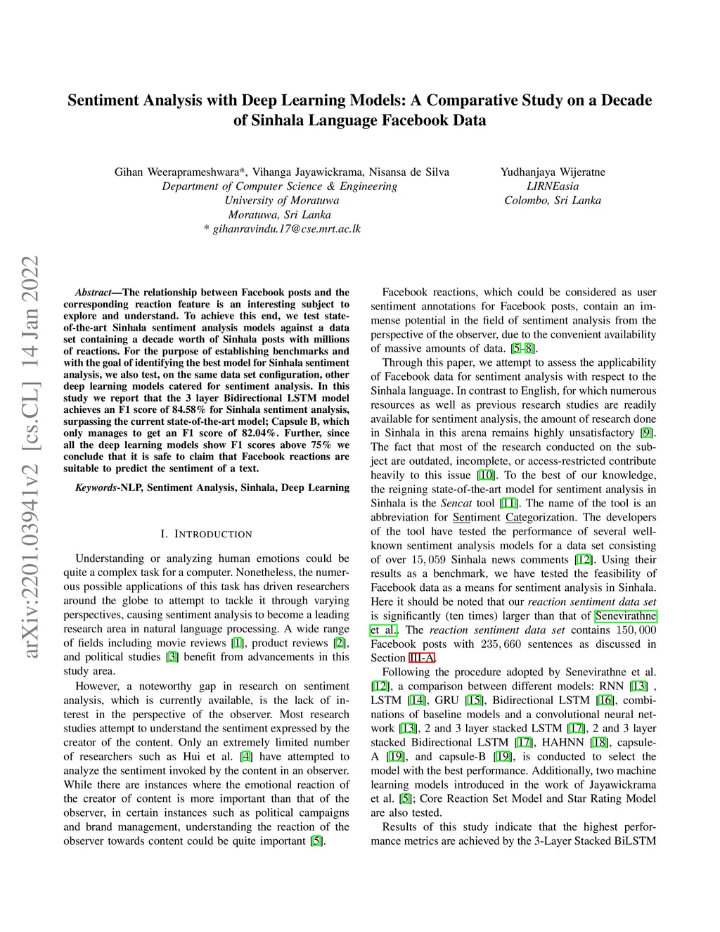 The relationship between Facebook posts and the corresponding reaction feature is an interesting subject to explore and understand. To achieve this end, we test state-of-the-art Sinhala sentiment analysis models against a data set containing a decade worth of Sinhala posts with millions of reactions. For the purpose of establishing benchmarks and with the goal of identifying the best model for Sinhala sentiment analysis, we also test, on the same data set configuration, other deep learning models catered for sentiment analysis. In this study we report that the 3 layer Bidirectional LSTM model achieves an F1 score of 84.58% for Sinhala sentiment analysis, surpassing the current state-of-the-art model; Capsule B, which only manages to get an F1 score of 82.04%. Further, since all the deep learning models show F1 scores above 75% we conclude that it is safe to claim that Facebook reactions are suitable to predict the sentiment of a text.
