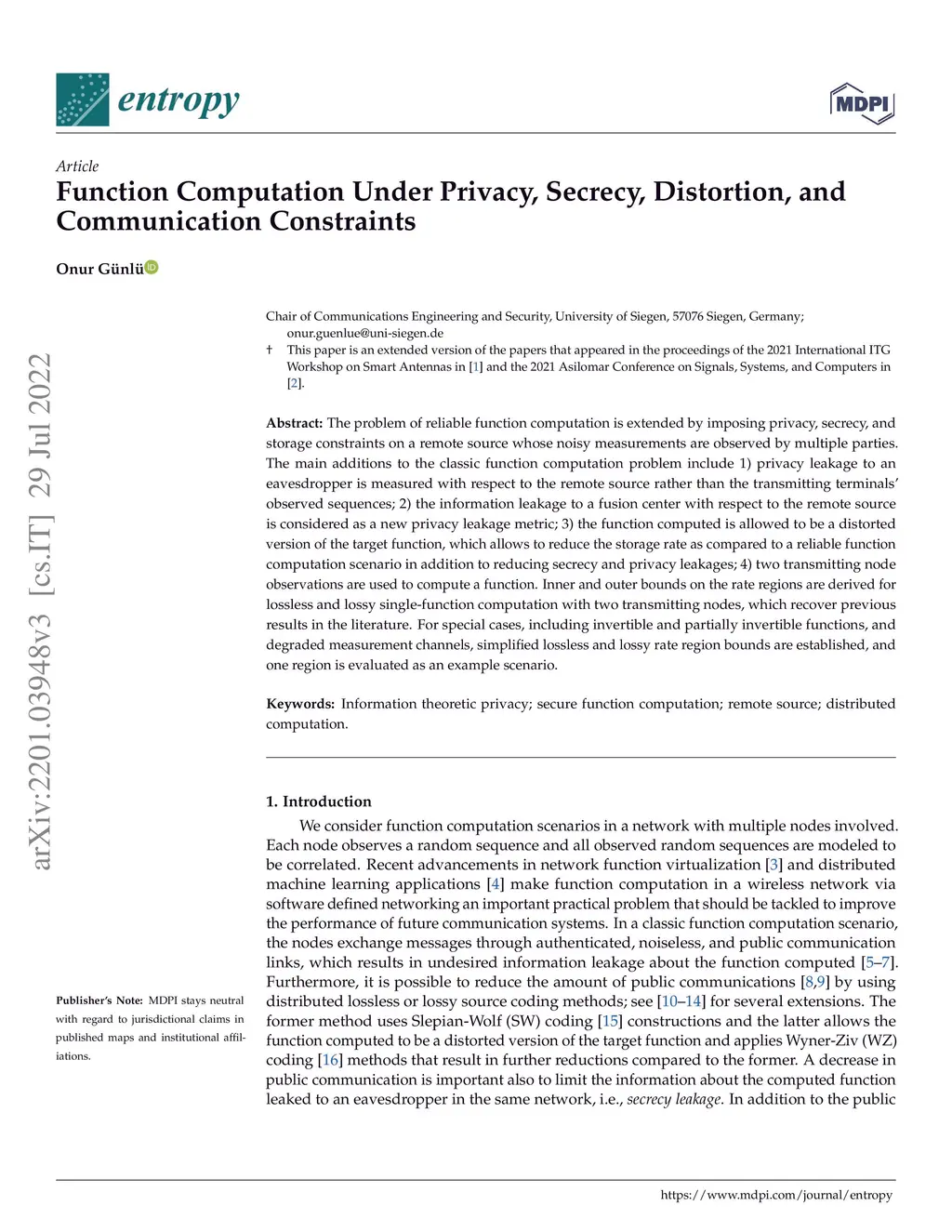 The problem of reliable function computation is extended by imposing privacy, secrecy, and storage constraints on a remote source whose noisy measurements are observed by multiple parties. The main additions to the classic function computation problem include 1) privacy leakage to an eavesdropper is measured with respect to the remote source rather than the transmitting terminals' observed sequences; 2) the information leakage to a fusion center with respect to the remote source is considered as a new privacy leakage metric; 3) the function computed is allowed to be a distorted version of the target function, which allows to reduce the storage rate as compared to a reliable function computation scenario in addition to reducing secrecy and privacy leakages; 4) two transmitting node observations are used to compute a function. Inner and outer bounds on the rate regions are derived for lossless and lossy single-function computation with two transmitting nodes, which recover previous results in the literature. For special cases, including invertible and partially invertible functions, and degraded measurement channels, simplified lossless and lossy rate region bounds are established, and one region is evaluated as an example scenario.