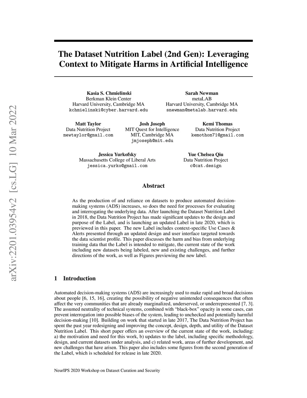 The Dataset Nutrition Label (2nd Gen): Leveraging Context to Mitigate