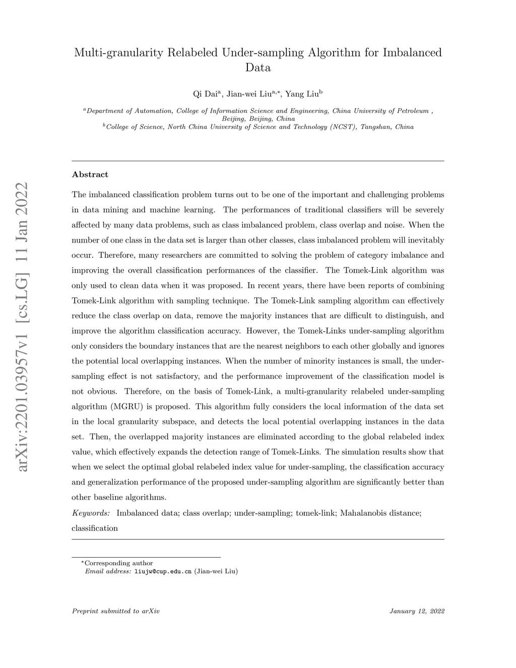 The imbalanced classification problem turns out to be one of the important and challenging problems in data mining and machine learning. The performances of traditional classifiers will be severely affected by many data problems, such as class imbalanced problem, class overlap and noise. The Tomek-Link algorithm was only used to clean data when it was proposed. In recent years, there have been reports of combining Tomek-Link algorithm with sampling technique. The Tomek-Link sampling algorithm can effectively reduce the class overlap on data, remove the majority instances that are difficult to distinguish, and improve the algorithm classification accuracy. However, the Tomek-Links under-sampling algorithm only considers the boundary instances that are the nearest neighbors to each other globally and ignores the potential local overlapping instances. When the number of minority instances is small, the under-sampling effect is not satisfactory, and the performance improvement of the classification model is not obvious. Therefore, on the basis of Tomek-Link, a multi-granularity relabeled under-sampling algorithm (MGRU) is proposed. This algorithm fully considers the local information of the data set in the local granularity subspace, and detects the local potential overlapping instances in the data set. Then, the overlapped majority instances are eliminated according to the global relabeled index value, which effectively expands the detection range of Tomek-Links. The simulation results show that when we select the optimal global relabeled index value for under-sampling, the classification accuracy and generalization performance of the proposed under-sampling algorithm are significantly better than other baseline algorithms.