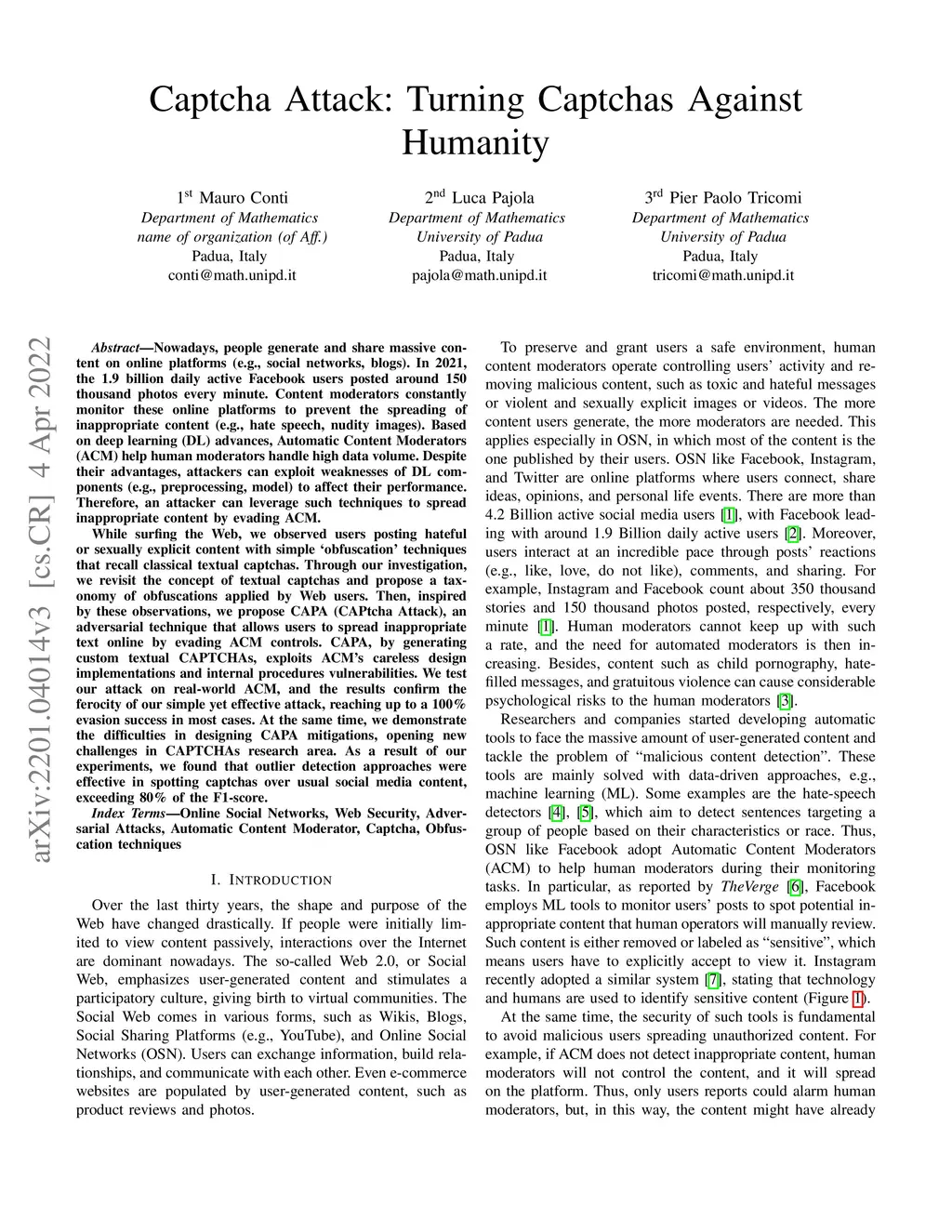 Nowadays, people generate and share massive content on online platforms (e.g., social networks, blogs). In 2021, the 1.9 billion daily active Facebook users posted around 150 thousand photos every minute. Content moderators constantly monitor these online platforms to prevent the spreading of inappropriate content (e.g., hate speech, nudity images). Based on deep learning (DL) advances, Automatic Content Moderators (ACM) help human moderators handle high data volume. Despite their advantages, attackers can exploit weaknesses of DL components (e.g., preprocessing, model) to affect their performance. Therefore, an attacker can leverage such techniques to spread inappropriate content by evading ACM. In this work, we propose CAPtcha Attack (CAPA), an adversarial technique that allows users to spread inappropriate text online by evading ACM controls. CAPA, by generating custom textual CAPTCHAs, exploits ACM's careless design implementations and internal procedures vulnerabilities. We test our attack on real-world ACM, and the results confirm the ferocity of our simple yet effective attack, reaching up to a 100% evasion success in most cases. At the same time, we demonstrate the difficulties in designing CAPA mitigations, opening new challenges in CAPTCHAs research area.
