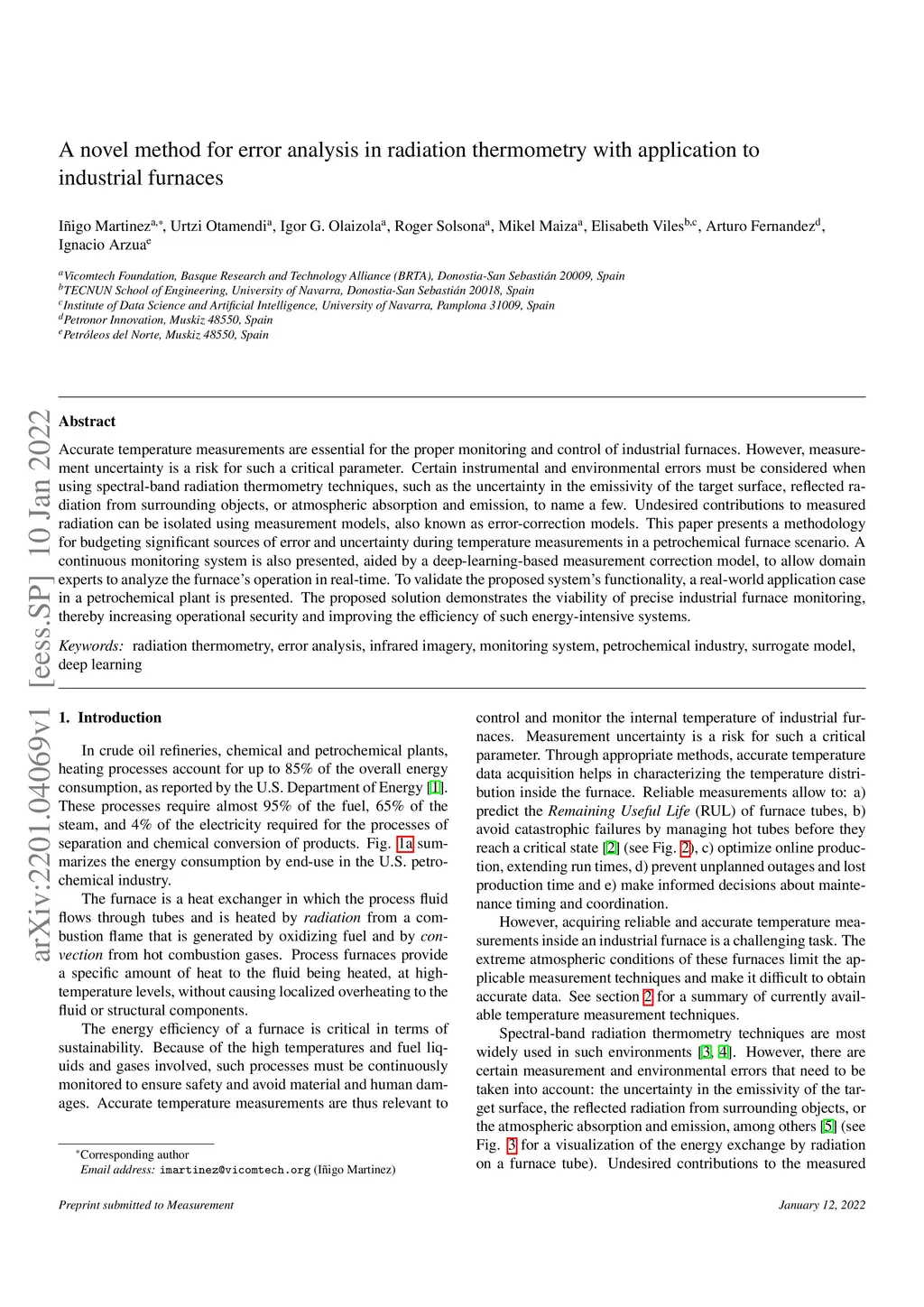 Accurate temperature measurements are essential for the proper monitoring and control of industrial furnaces. However, measurement uncertainty is a risk for such a critical parameter. Certain instrumental and environmental errors must be considered when using spectral-band radiation thermometry techniques, such as the uncertainty in the emissivity of the target surface, reflected radiation from surrounding objects, or atmospheric absorption and emission, to name a few. Undesired contributions to measured radiation can be isolated using measurement models, also known as error-correction models. This paper presents a methodology for budgeting significant sources of error and uncertainty during temperature measurements in a petrochemical furnace scenario. A continuous monitoring system is also presented, aided by a deep-learning-based measurement correction model, to allow domain experts to analyze the furnace's operation in real-time. To validate the proposed system's functionality, a real-world application case in a petrochemical plant is presented. The proposed solution demonstrates the viability of precise industrial furnace monitoring, thereby increasing operational security and improving the efficiency of such energy-intensive systems.