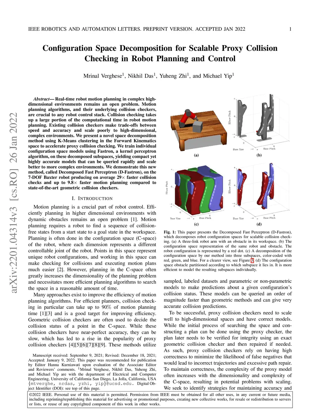 Real-time robot motion planning in complex high-dimensional environments remains an open problem. Motion planning algorithms, and their underlying collision checkers, are crucial to any robot control stack. Collision checking takes up a large portion of the computational time in robot motion planning. Existing collision checkers make trade-offs between speed and accuracy and scale poorly to high-dimensional, complex environments. We present a novel space decomposition method using K-Means clustering in the Forward Kinematics space to accelerate proxy collision checking. We train individual configuration space models using Fastron, a kernel perceptron algorithm, on these decomposed subspaces, yielding compact yet highly accurate models that can be queried rapidly and scale better to more complex environments. We demonstrate this new method, called Decomposed Fast Perceptron (D-Fastron), on the 7-DOF Baxter robot producing on average 29x faster collision checks and up to 9.8x faster motion planning compared to state-of-the-art geometric collision checkers.