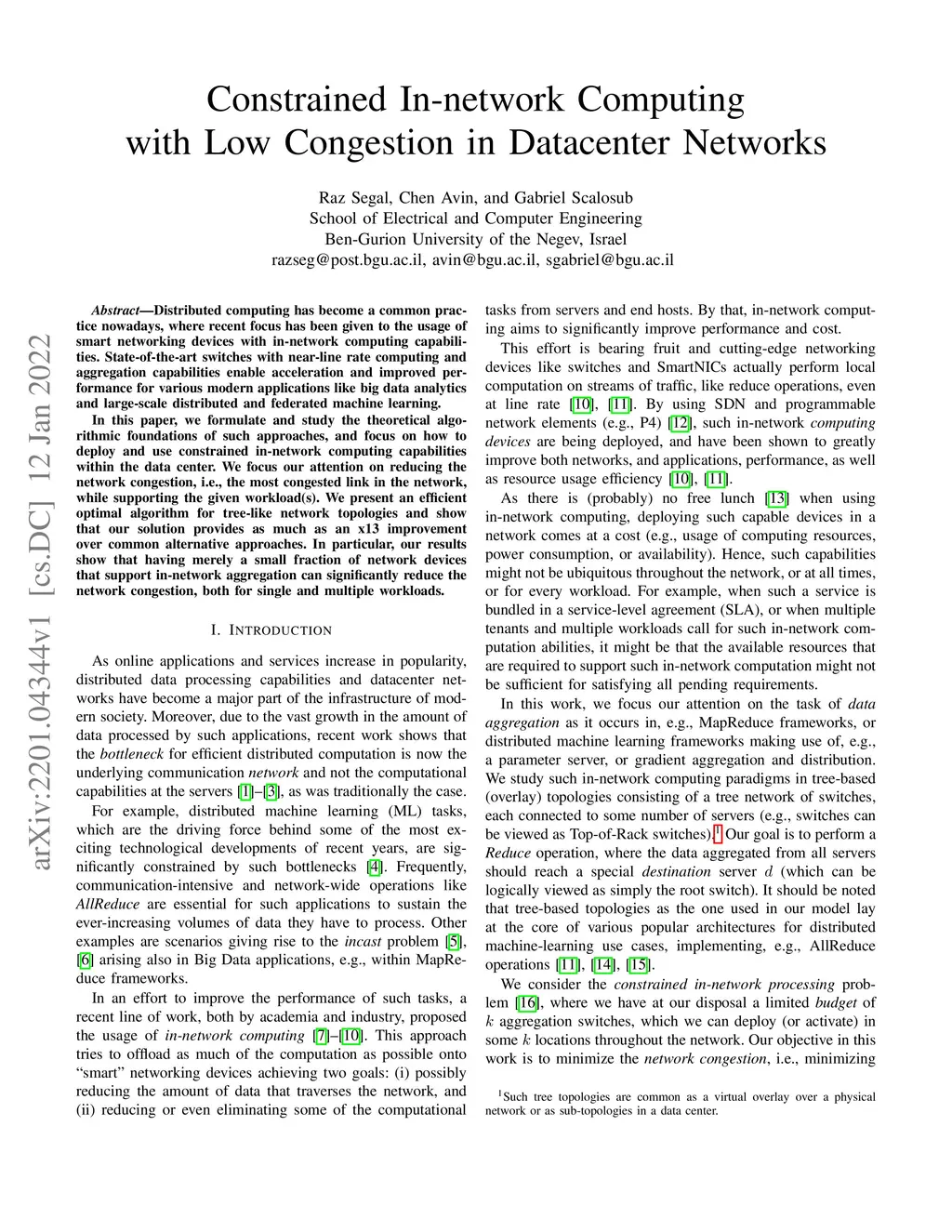 Distributed computing has become a common practice nowadays, where the recent focus has been given to the usage of smart networking devices with in-network computing capabilities. State-of-the-art switches with near-line rate computing and aggregation capabilities enable acceleration and improved performance for various modern applications like big data analytics and large-scale distributed and federated machine learning. In this paper, we formulate and study the theoretical algorithmic foundations of such approaches, and focus on how to deploy and use constrained in-network computing capabilities within the data center. We focus our attention on reducing the network congestion, i.e., the most congested link in the network, while supporting the given workload(s). We present an efficient optimal algorithm for tree-like network topologies and show that our solution provides as much as an x13 improvement over common alternative approaches. In particular, our results show that having merely a small fraction of network devices that support in-network aggregation can significantly reduce the network congestion, both for single and multiple workloads.
