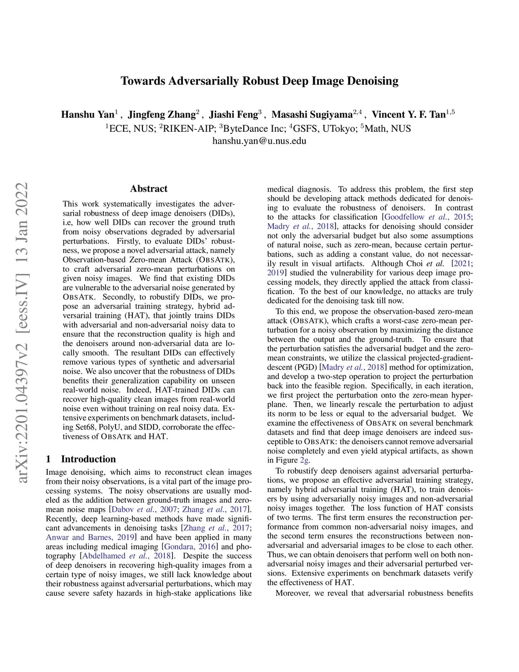 This work systematically investigates the adversarial robustness of deep image denoisers (DIDs), i.e, how well DIDs can recover the ground truth from noisy observations degraded by adversarial perturbations. Firstly, to evaluate DIDs' robustness, we propose a novel adversarial attack, namely Observation-based Zero-mean Attack ({\sc ObsAtk}), to craft adversarial zero-mean perturbations on given noisy images. We find that existing DIDs are vulnerable to the adversarial noise generated by {\sc ObsAtk}. Secondly, to robustify DIDs, we propose an adversarial training strategy, hybrid adversarial training ({\sc HAT}), that jointly trains DIDs with adversarial and non-adversarial noisy data to ensure that the reconstruction quality is high and the denoisers around non-adversarial data are locally smooth. The resultant DIDs can effectively remove various types of synthetic and adversarial noise. We also uncover that the robustness of DIDs benefits their generalization capability on unseen real-world noise. Indeed, {\sc HAT}-trained DIDs can recover high-quality clean images from real-world noise even without training on real noisy data. Extensive experiments on benchmark datasets, including Set68, PolyU, and SIDD, corroborate the effectiveness of {\sc ObsAtk} and {\sc HAT}.
