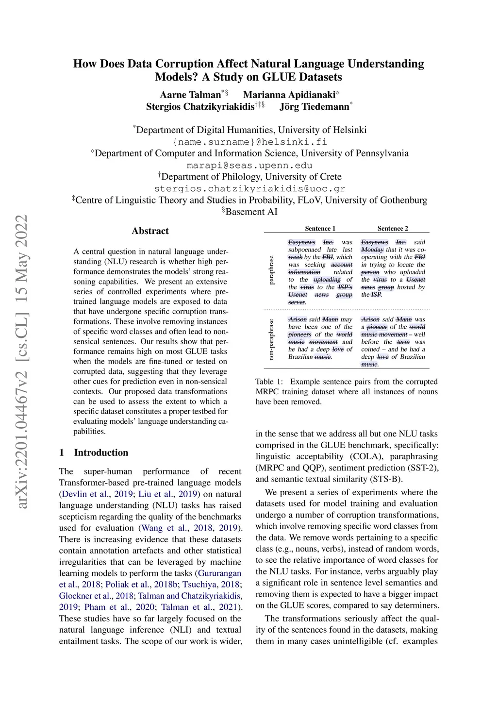 A central question in natural language understanding (NLU) research is whether high performance demonstrates the models' strong reasoning capabilities. We present an extensive series of controlled experiments where pre-trained language models are exposed to data that have undergone specific corruption transformations. These involve removing instances of specific word classes and often lead to non-sensical sentences. Our results show that performance remains high on most GLUE tasks when the models are fine-tuned or tested on corrupted data, suggesting that they leverage other cues for prediction even in non-sensical contexts. Our proposed data transformations can be used to assess the extent to which a specific dataset constitutes a proper testbed for evaluating models' language understanding capabilities.
