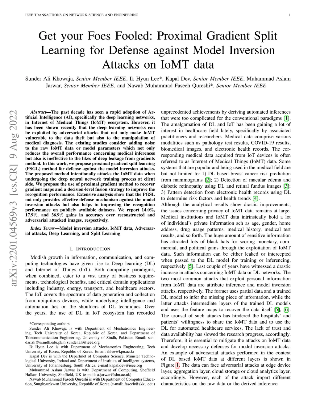 The past decade has seen a rapid adoption of Artificial Intelligence (AI), specifically the deep learning networks, in Internet of Medical Things (IoMT) ecosystem. However, it has been shown recently that the deep learning networks can be exploited by adversarial attacks that not only make IoMT vulnerable to the data theft but also to the manipulation of medical diagnosis. The existing studies consider adding noise to the raw IoMT data or model parameters which not only reduces the overall performance concerning medical inferences but also is ineffective to the likes of deep leakage from gradients method. In this work, we propose proximal gradient split learning (PSGL) method for defense against the model inversion attacks. The proposed method intentionally attacks the IoMT data when undergoing the deep neural network training process at client side. We propose the use of proximal gradient method to recover gradient maps and a decision-level fusion strategy to improve the recognition performance. Extensive analysis show that the PGSL not only provides effective defense mechanism against the model inversion attacks but also helps in improving the recognition performance on publicly available datasets. We report 14.0, 17.9, and 36.9 gains in accuracy over reconstructed and adversarial attacked images, respectively.