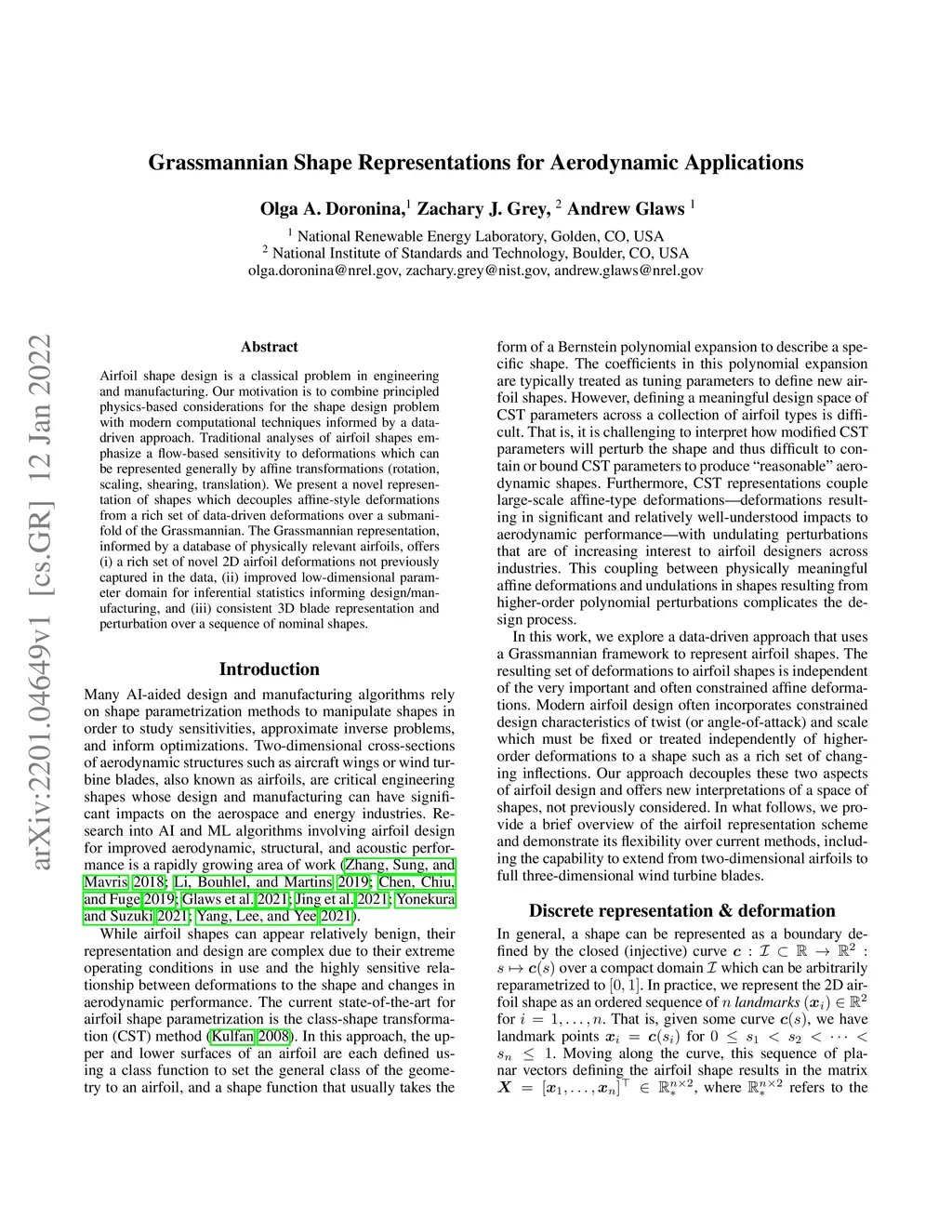 Airfoil shape design is a classical problem in engineering and manufacturing. Our motivation is to combine principled physics-based considerations for the shape design problem with modern computational techniques informed by a data-driven approach. Traditional analyses of airfoil shapes emphasize a flow-based sensitivity to deformations which can be represented generally by affine transformations (rotation, scaling, shearing, translation). We present a novel representation of shapes which decouples affine-style deformations from a rich set of data-driven deformations over a submanifold of the Grassmannian. The Grassmannian representation, informed by a database of physically relevant airfoils, offers (i) a rich set of novel 2D airfoil deformations not previously captured in the data, (ii) improved low-dimensional parameter domain for inferential statistics informing design/manufacturing, and (iii) consistent 3D blade representation and perturbation over a sequence of nominal shapes.