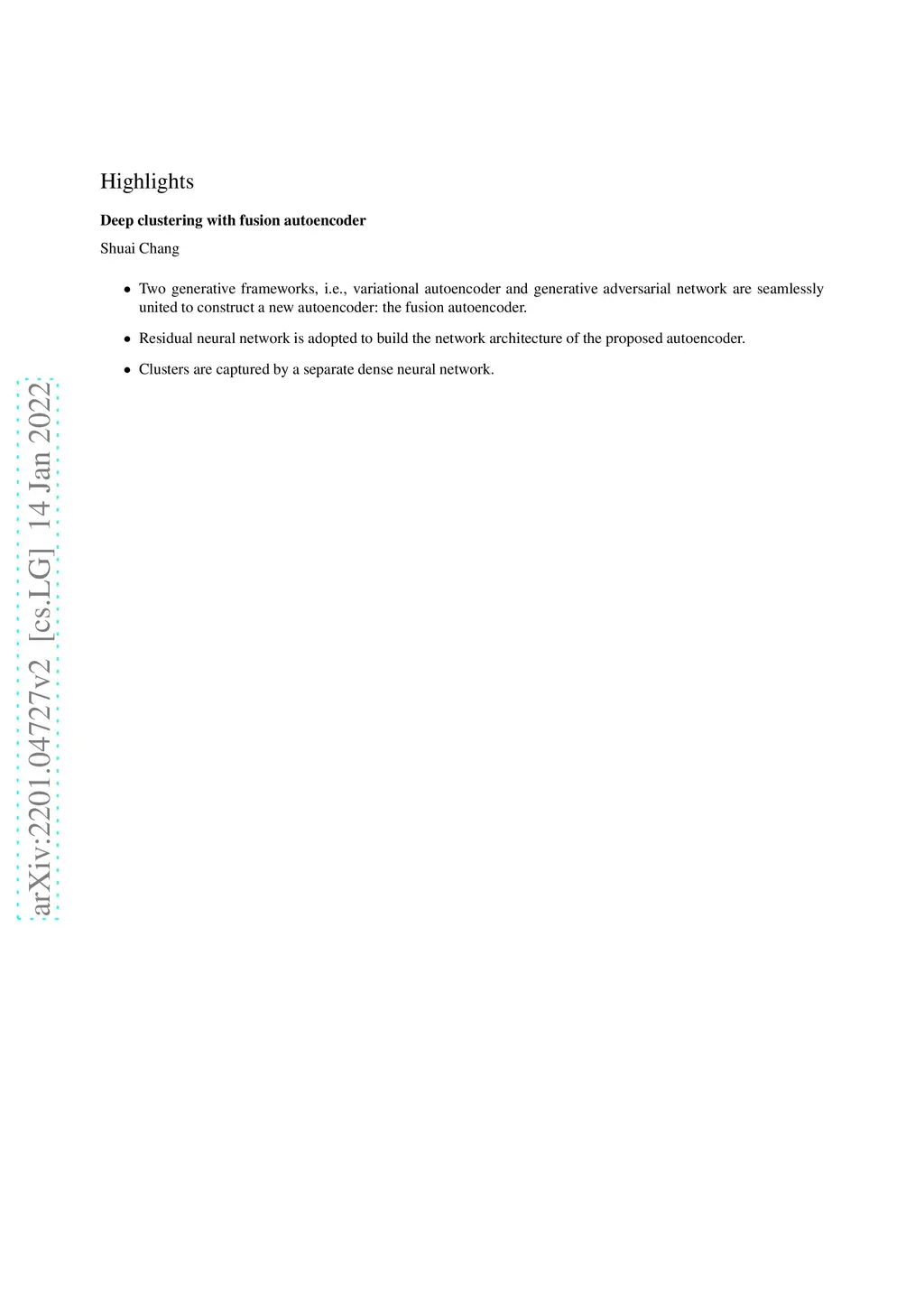 Embracing the deep learning techniques for representation learning in clustering research has attracted broad attention in recent years, yielding a newly developed clustering paradigm, viz. the deep clustering (DC). Typically, the DC models capitalize on autoencoders to learn the intrinsic features which facilitate the clustering process in consequence. Nowadays, a generative model named variational autoencoder (VAE) has got wide acceptance in DC studies. Nevertheless, the plain VAE is insufficient to perceive the comprehensive latent features, leading to the deteriorative clustering performance. In this paper, a novel DC method is proposed to address this issue. Specifically, the generative adversarial network and VAE are coalesced into a new autoencoder called fusion autoencoder (FAE) for discerning more discriminative representation that benefits the downstream clustering task. Besides, the FAE is implemented with the deep residual network architecture which further enhances the representation learning ability. Finally, the latent space of the FAE is transformed to an embedding space shaped by a deep dense neural network for pulling away different clusters from each other and collapsing data points within individual clusters. Experiment conducted on several image datasets demonstrate the effectiveness of the proposed DC model against the baseline methods.