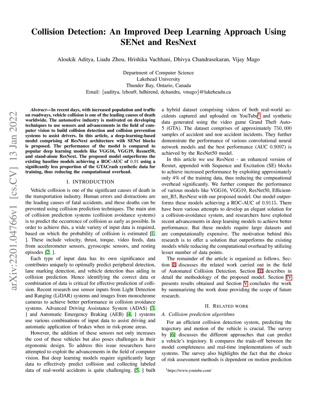 In recent days, with increased population and traffic on roadways, vehicle collision is one of the leading causes of death worldwide. The automotive industry is motivated on developing techniques to use sensors and advancements in the field of computer vision to build collision detection and collision prevention systems to assist drivers. In this article, a deep-learning-based model comprising of ResNext architecture with SENet blocks is proposed. The performance of the model is compared to popular deep learning models like VGG16, VGG19, Resnet50, and stand-alone ResNext. The proposed model outperforms the existing baseline models achieving a ROC-AUC of 0.91 using a significantly less proportion of the GTACrash synthetic data for training, thus reducing the computational overhead.