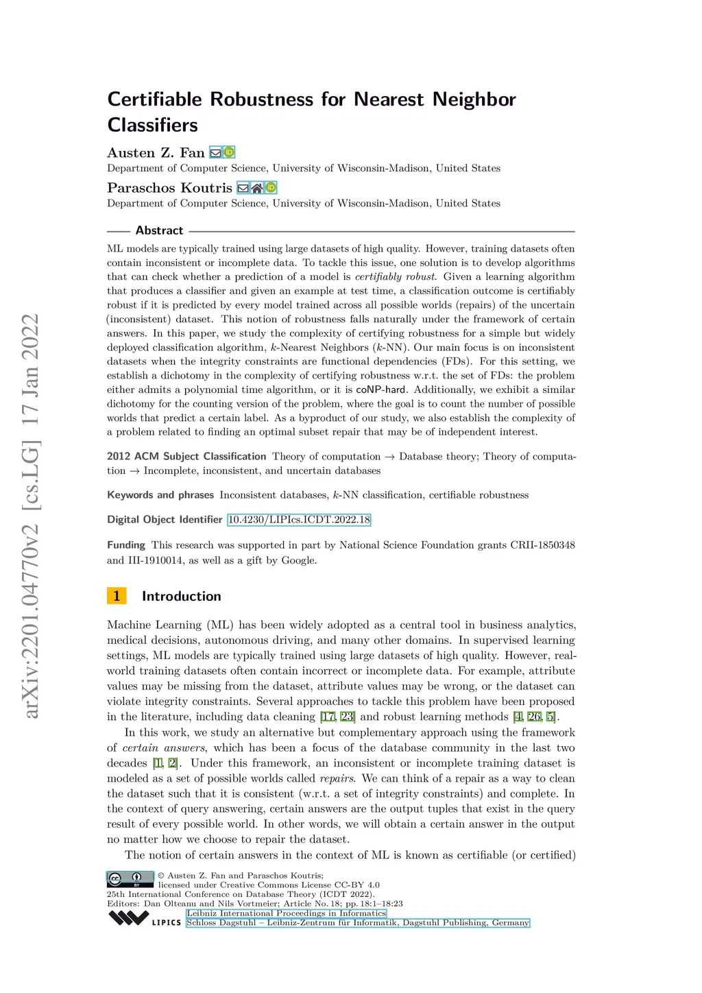 Certifiable Robustness for Nearest Neighbor Classifiers