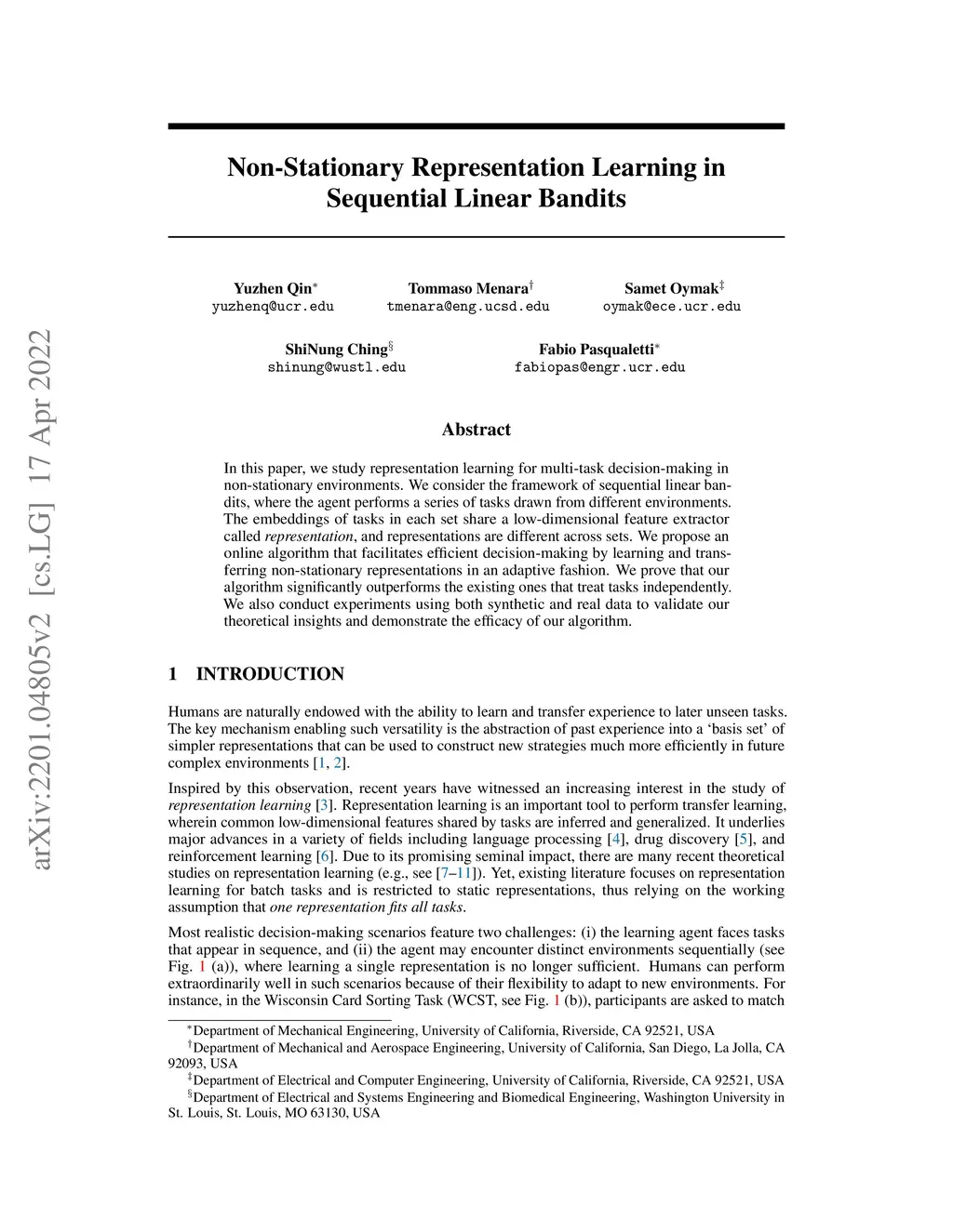 In this paper, we study representation learning for multi-task decision-making in non-stationary environments. We consider the framework of sequential linear bandits, where the agent performs a series of tasks drawn from distinct sets associated with different environments. The embeddings of tasks in each set share a low-dimensional feature extractor called representation, and representations are different across sets. We propose an online algorithm that facilitates efficient decision-making by learning and transferring non-stationary representations in an adaptive fashion. We prove that our algorithm significantly outperforms the existing ones that treat tasks independently. We also conduct experiments using both synthetic and real data to validate our theoretical insights and demonstrate the efficacy of our algorithm.
