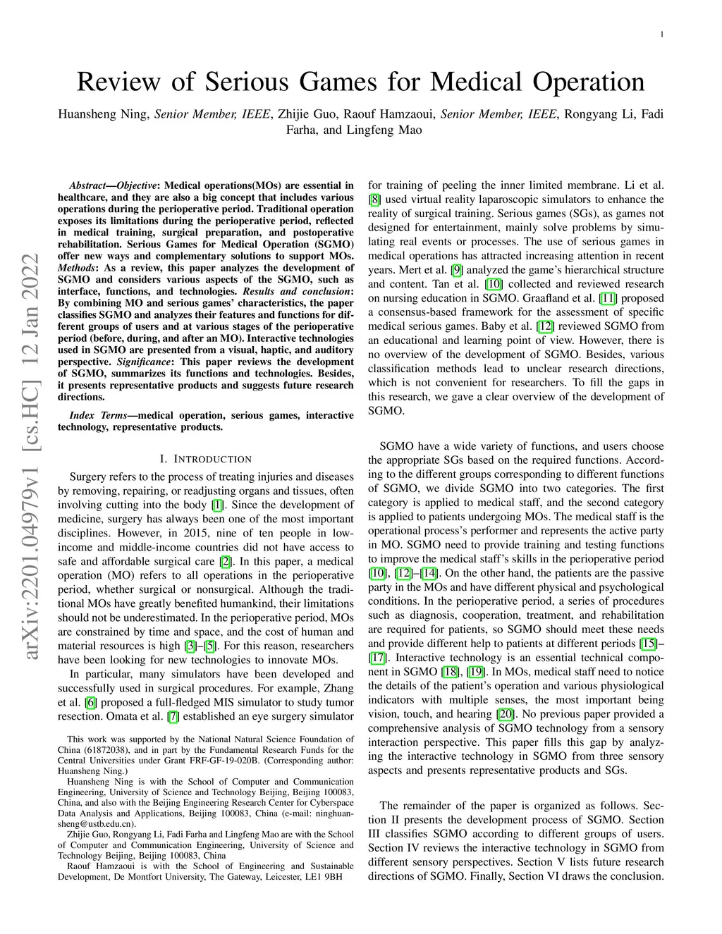 Medical operations (MOs) are essential in healthcare,and they are also a big concept that includes various operations during the perioperative period.Traditional operation exposes its limitations during the perioperative period,reflected in medical training,surgical preparation,and postoperative rehabilitation.Serious Games for Medical Operation (SGMO) offer new ways and complementary solutions to support MOs.As a review,this paper analyzes the development of SGMO and considers various aspects of the SGMO,such as interface,functions,and technologies.By combining MO and serious games characteristics,the paper classifies SGMO and analyzes their features and functions for different groups of users and at various stages of the perioperative period (before,during,and after an MO).Interactive technologies used in SGMO are presented from a visual,haptic,and auditory perspective.This paper reviews the development of SGMO,summarizes its functions and technologies.Besides,it presents representative products and suggests future research directions.