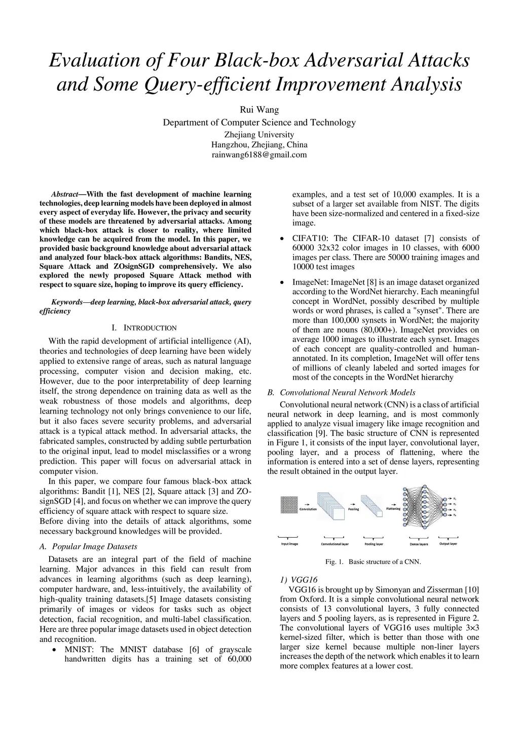 With the fast development of machine learning technologies, deep learning models have been deployed in almost every aspect of everyday life. However, the privacy and security of these models are threatened by adversarial attacks. Among which black-box attack is closer to reality, where limited knowledge can be acquired from the model. In this paper, we provided basic background knowledge about adversarial attack and analyzed four black-box attack algorithms: Bandits, NES, Square Attack and ZOsignSGD comprehensively. We also explored the newly proposed Square Attack method with respect to square size, hoping to improve its query efficiency.