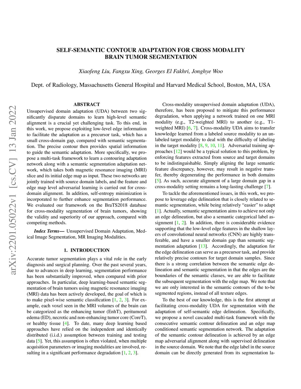 Unsupervised domain adaptation (UDA) between two significantly disparate domains to learn high-level semantic alignment is a crucial yet challenging task.~To this end, in this work, we propose exploiting low-level edge information to facilitate the adaptation as a precursor task, which has a small cross-domain gap, compared with semantic segmentation.~The precise contour then provides spatial information to guide the semantic adaptation. More specifically, we propose a multi-task framework to learn a contouring adaptation network along with a semantic segmentation adaptation network, which takes both magnetic resonance imaging (MRI) slice and its initial edge map as input.~These two networks are jointly trained with source domain labels, and the feature and edge map level adversarial learning is carried out for cross-domain alignment. In addition, self-entropy minimization is incorporated to further enhance segmentation performance. We evaluated our framework on the BraTS2018 database for cross-modality segmentation of brain tumors, showing the validity and superiority of our approach, compared with competing methods.