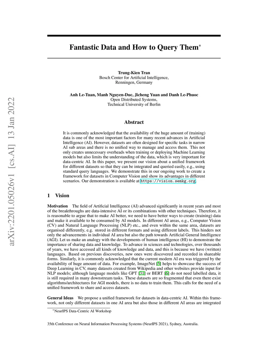 It is commonly acknowledged that the availability of the huge amount of (training) data is one of the most important factors for many recent advances in Artificial Intelligence (AI). However, datasets are often designed for specific tasks in narrow AI sub areas and there is no unified way to manage and access them. This not only creates unnecessary overheads when training or deploying Machine Learning models but also limits the understanding of the data, which is very important for data-centric AI. In this paper, we present our vision about a unified framework for different datasets so that they can be integrated and queried easily, e.g., using standard query languages. We demonstrate this in our ongoing work to create a framework for datasets in Computer Vision and show its advantages in different scenarios. Our demonstration is available at https://vision.semkg.org.