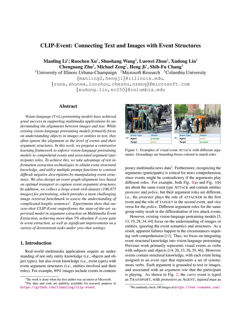 Vision-language (V+L) pretraining models have achieved great success in supporting multimedia applications by understanding the alignments between images and text. While existing vision-language pretraining models primarily focus on understanding objects in images or entities in text, they often ignore the alignment at the level of events and their argument structures. In this work, we propose a contrastive learning framework to enforce vision-language pretraining models to comprehend events and associated argument (participant) roles. To achieve this, we take advantage of text information extraction technologies to obtain event structural knowledge, and utilize multiple prompt functions to contrast difficult negative descriptions by manipulating event structures. We also design an event graph alignment loss based on optimal transport to capture event argument structures. In addition, we collect a large event-rich dataset (106,875 images) for pretraining, which provides a more challenging image retrieval benchmark to assess the understanding of complicated lengthy sentences. Experiments show that our zero-shot CLIP-Event outperforms the state-of-the-art supervised model in argument extraction on Multimedia Event Extraction, achieving more than 5% absolute F-score gain in event extraction, as well as significant improvements on a variety of downstream tasks under zero-shot settings.