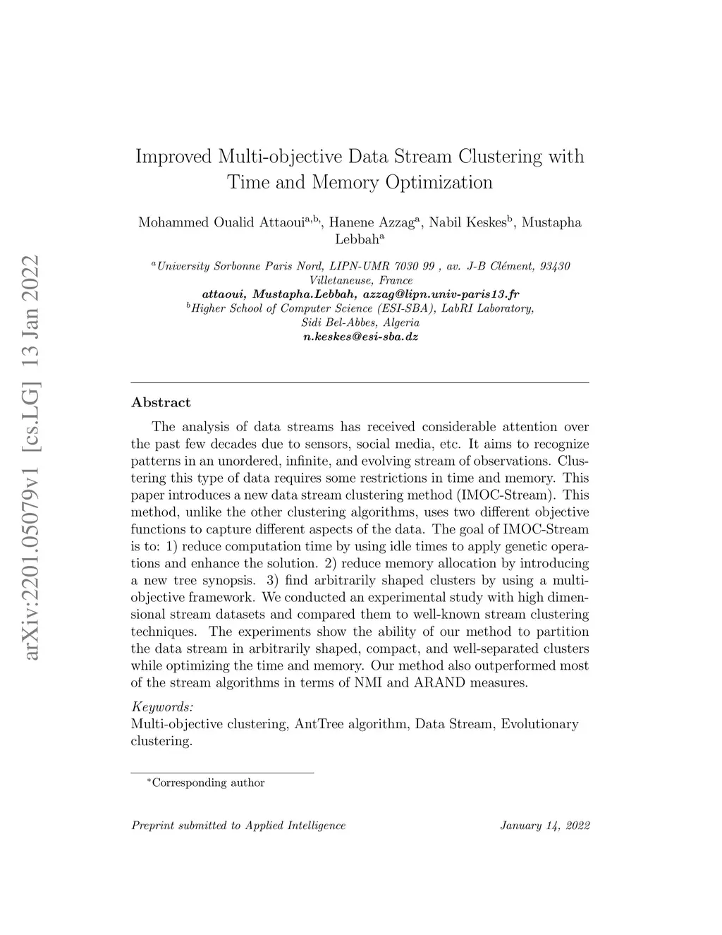 The analysis of data streams has received considerable attention over the past few decades due to sensors, social media, etc. It aims to recognize patterns in an unordered, infinite, and evolving stream of observations. Clustering this type of data requires some restrictions in time and memory. This paper introduces a new data stream clustering method (IMOC-Stream). This method, unlike the other clustering algorithms, uses two different objective functions to capture different aspects of the data. The goal of IMOC-Stream is to: 1) reduce computation time by using idle times to apply genetic operations and enhance the solution. 2) reduce memory allocation by introducing a new tree synopsis. 3) find arbitrarily shaped clusters by using a multi-objective framework. We conducted an experimental study with high dimensional stream datasets and compared them to well-known stream clustering techniques. The experiments show the ability of our method to partition the data stream in arbitrarily shaped, compact, and well-separated clusters while optimizing the time and memory. Our method also outperformed most of the stream algorithms in terms of NMI and ARAND measures.