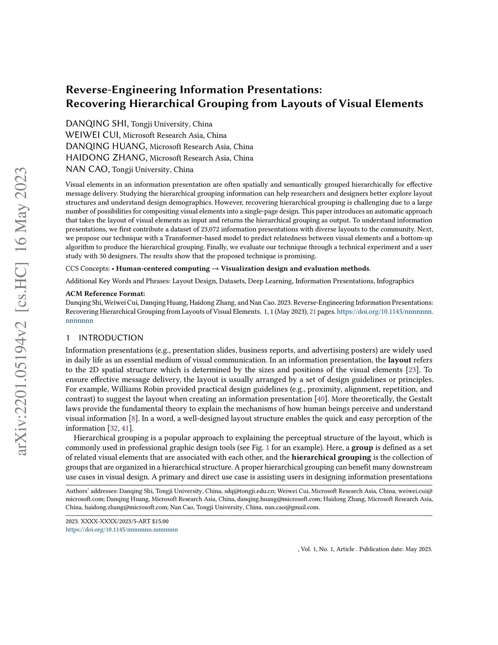 Visual elements in an information presentation are often spatially and semantically grouped hierarchically for effective message delivery. Studying the hierarchical grouping information can help researchers and designers better explore layout structures and understand design demographics. However, recovering hierarchical grouping is challenging due to a large number of possibilities for compositing visual elements into a single-page design. This paper introduces an automatic approach that takes the layout of visual elements as input and returns the hierarchical grouping as output. To understand information presentations, we first contribute a dataset of 23,072 information presentations with diverse layouts to the community. Next, we propose our technique with a Transformer-based model to predict relatedness between visual elements and a bottom-up algorithm to produce the hierarchical grouping. Finally, we evaluate our technique through a technical experiment and a user study with 30 designers. The results show that the proposed technique is promising.