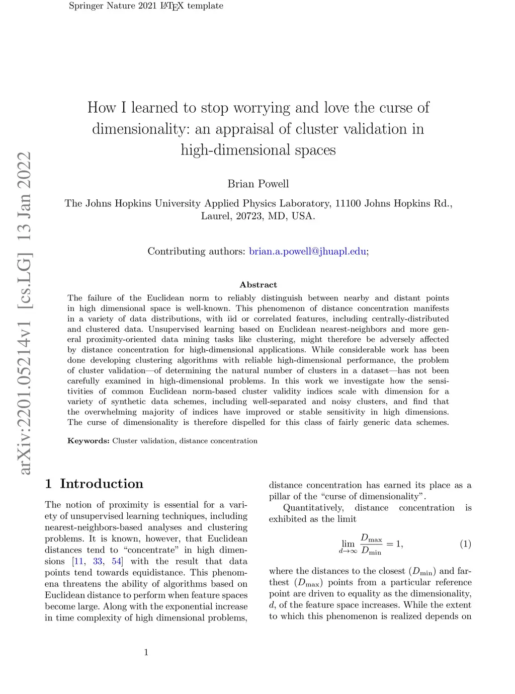 The failure of the Euclidean norm to reliably distinguish between nearby and distant points in high dimensional space is well-known. This phenomenon of distance concentration manifests in a variety of data distributions, with iid or correlated features, including centrally-distributed and clustered data. Unsupervised learning based on Euclidean nearest-neighbors and more general proximity-oriented data mining tasks like clustering, might therefore be adversely affected by distance concentration for high-dimensional applications. While considerable work has been done developing clustering algorithms with reliable high-dimensional performance, the problem of cluster validation--of determining the natural number of clusters in a dataset--has not been carefully examined in high-dimensional problems. In this work we investigate how the sensitivities of common Euclidean norm-based cluster validity indices scale with dimension for a variety of synthetic data schemes, including well-separated and noisy clusters, and find that the overwhelming majority of indices have improved or stable sensitivity in high dimensions. The curse of dimensionality is therefore dispelled for this class of fairly generic data schemes.
