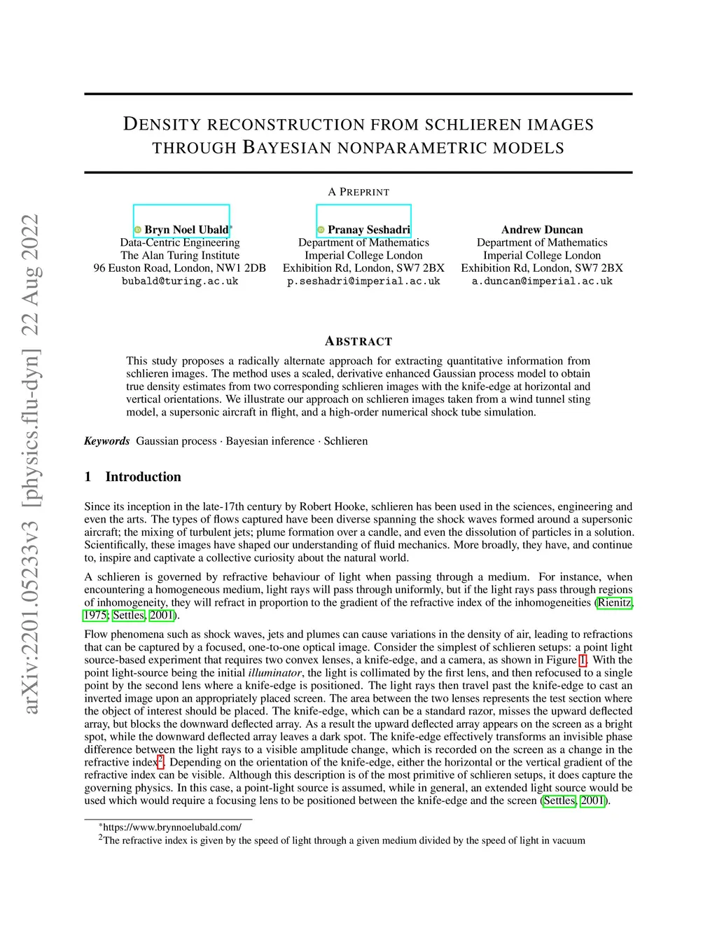 This study proposes a radically alternate approach for extracting quantitative information from schlieren images. The method uses a scaled, derivative enhanced Gaussian process model to obtain true density estimates from two corresponding schlieren images with the knife-edge at horizontal and vertical orientations. We illustrate our approach on schlieren images taken from a wind tunnel sting model, a supersonic aircraft in flight, and a high-order numerical shock tube simulation.
