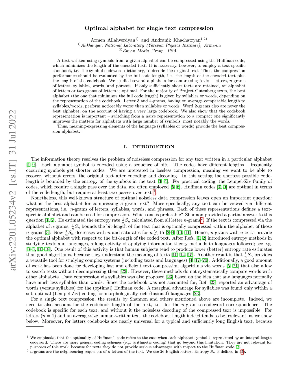 A text written using symbols from a given alphabet can be compressed using the Huffman code, which minimizes the length of the encoded text. It is necessary, however, to employ a text-specific codebook, i.e. the symbol-codeword dictionary, to decode the original text. Thus, the compression performance should be evaluated by the full code length, i.e. the length of the encoded text plus the length of the codebook. We studied several alphabets for compressing texts -- letters, n-grams of letters, syllables, words, and phrases. If only sufficiently short texts are retained, an alphabet of letters or two-grams of letters is optimal. For the majority of Project Gutenberg texts, the best alphabet (the one that minimizes the full code length) is given by syllables or words, depending on the representation of the codebook. Letter 3 and 4-grams, having on average comparable length to syllables/words, perform noticeably worse than syllables or words. Word 2-grams also are never the best alphabet, on the account of having a very large codebook. We also show that the codebook representation is important -- switching from a naive representation to a compact one significantly improves the matters for alphabets with large number of symbols, most notably the words. Thus, meaning-expressing elements of the language (syllables or words) provide the best compression alphabet.