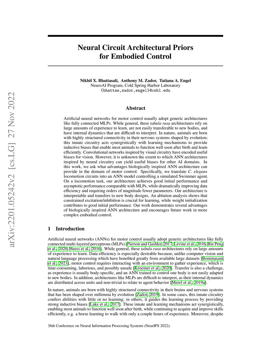 Artificial neural networks for motor control usually adopt generic architectures like fully connected MLPs. While general, these tabula rasa architectures rely on large amounts of experience to learn, are not easily transferable to new bodies, and have internal dynamics that are difficult to interpret. In nature, animals are born with highly structured connectivity in their nervous systems shaped by evolution; this innate circuitry acts synergistically with learning mechanisms to provide inductive biases that enable most animals to function well soon after birth and learn efficiently. Convolutional networks inspired by visual circuitry have encoded useful biases for vision. However, it is unknown the extent to which ANN architectures inspired by neural circuitry can yield useful biases for other AI domains. In this work, we ask what advantages biologically inspired ANN architecture can provide in the domain of motor control. Specifically, we translate C. elegans locomotion circuits into an ANN model controlling a simulated Swimmer agent. On a locomotion task, our architecture achieves good initial performance and asymptotic performance comparable with MLPs, while dramatically improving data efficiency and requiring orders of magnitude fewer parameters. Our architecture is interpretable and transfers to new body designs. An ablation analysis shows that constrained excitation/inhibition is crucial for learning, while weight initialization contributes to good initial performance. Our work demonstrates several advantages of biologically inspired ANN architecture and encourages future work in more complex embodied control.