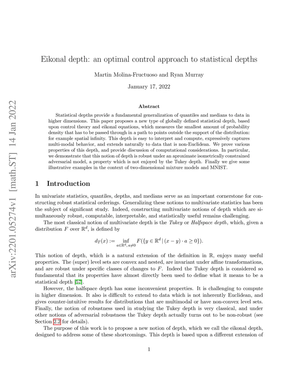 Statistical depths provide a fundamental generalization of quantiles and medians to data in higher dimensions. This paper proposes a new type of globally defined statistical depth, based upon control theory and eikonal equations, which measures the smallest amount of probability density that has to be passed through in a path to points outside the support of the distribution: for example spatial infinity. This depth is easy to interpret and compute, expressively captures multi-modal behavior, and extends naturally to data that is non-Euclidean. We prove various properties of this depth, and provide discussion of computational considerations. In particular, we demonstrate that this notion of depth is robust under an aproximate isometrically constrained adversarial model, a property which is not enjoyed by the Tukey depth. Finally we give some illustrative examples in the context of two-dimensional mixture models and MNIST.
