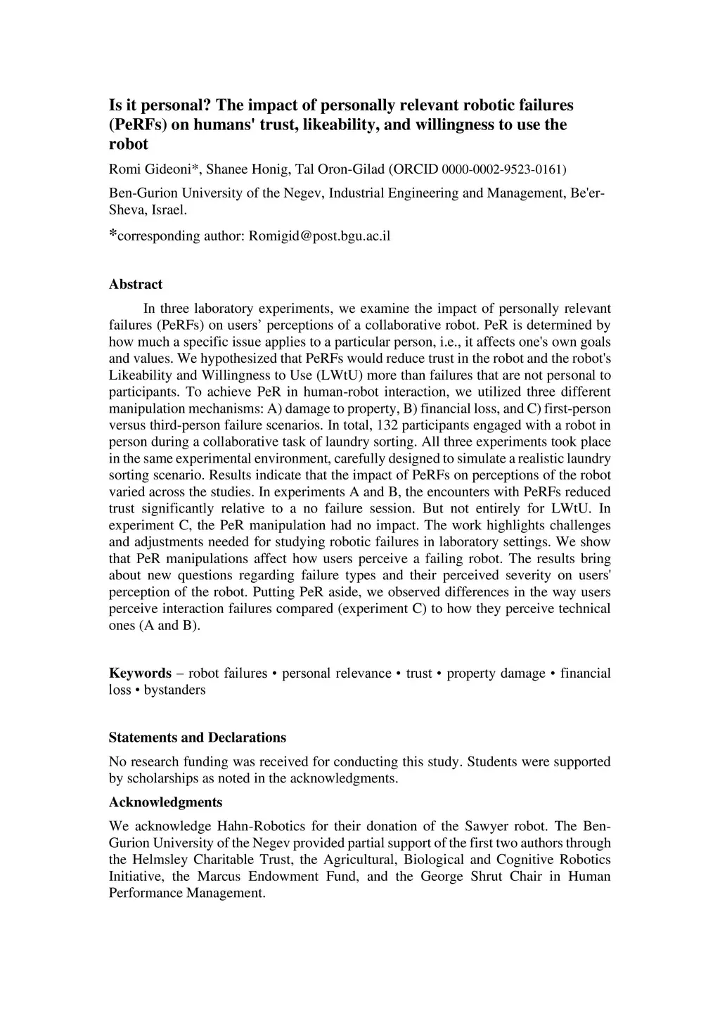 (PeRFs) on humans' trust, likeability, and willingness to use the robot