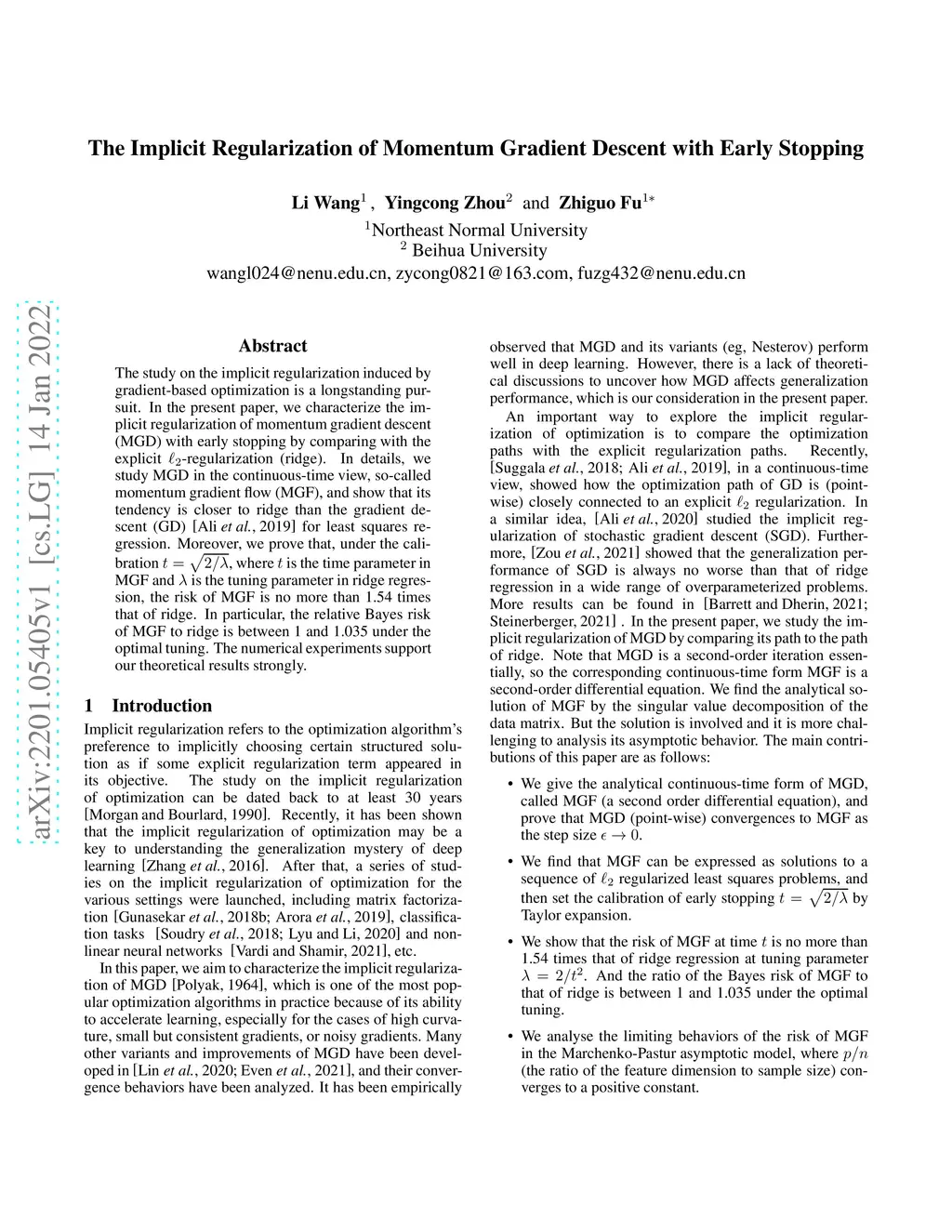 The study on the implicit regularization induced by gradient-based optimization is a longstanding pursuit. In the present paper, we characterize the implicit regularization of momentum gradient descent (MGD) with early stopping by comparing with the explicit -regularization (ridge). In details, we study MGD in the continuous-time view, so-called momentum gradient flow (MGF), and show that its tendency is closer to ridge than the gradient descent (GD) [Ali et al., 2019] for least squares regression. Moreover, we prove that, under the calibration , where is the time parameter in MGF and is the tuning parameter in ridge regression, the risk of MGF is no more than 1.54 times that of ridge. In particular, the relative Bayes risk of MGF to ridge is between 1 and 1.035 under the optimal tuning. The numerical experiments support our theoretical results strongly.