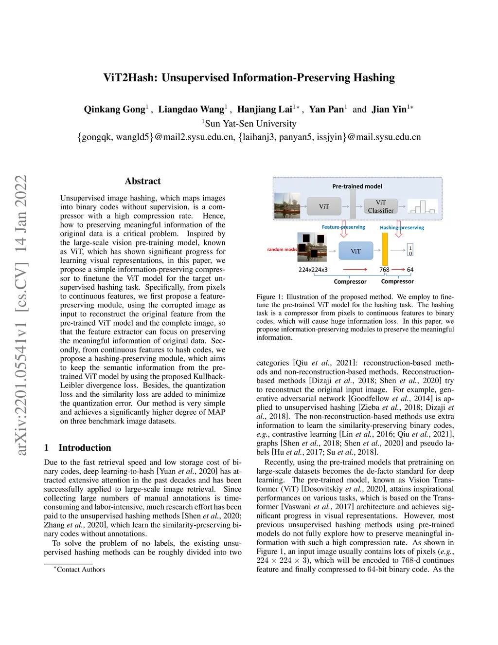 ViT2Hash: Unsupervised Information-Preserving Hashing