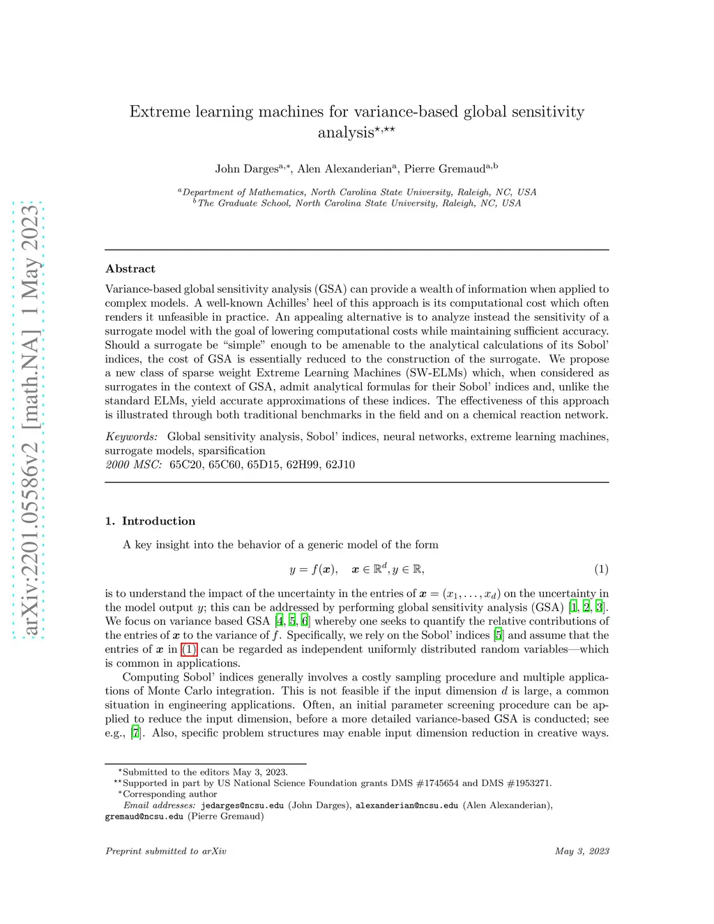 Variance-based global sensitivity analysis (GSA) can provide a wealth of information when applied to complex models. A well-known Achilles' heel of this approach is its computational cost which often renders it unfeasible in practice. An appealing alternative is to analyze instead the sensitivity of a surrogate model with the goal of lowering computational costs while maintaining sufficient accuracy. Should a surrogate be "simple" enough to be amenable to the analytical calculations of its Sobol' indices, the cost of GSA is essentially reduced to the construction of the surrogate. We propose a new class of sparse weight Extreme Learning Machines (SW-ELMs) which, when considered as surrogates in the context of GSA, admit analytical formulas for their Sobol' indices and, unlike the standard ELMs, yield accurate approximations of these indices. The effectiveness of this approach is illustrated through both traditional benchmarks in the field and on a chemical reaction network.