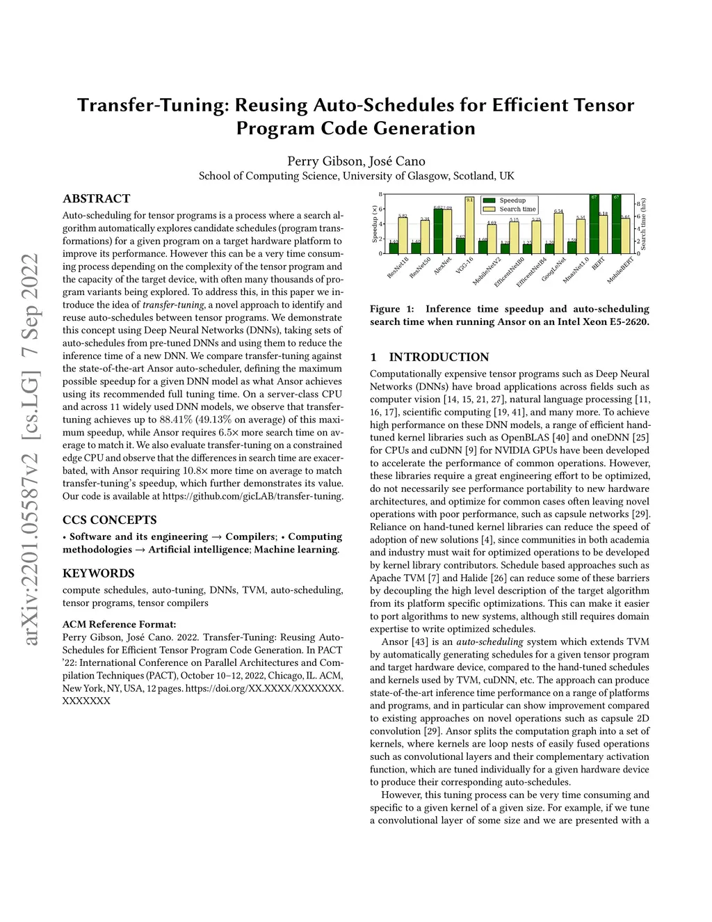 Auto-scheduling for tensor programs is a process where a search algorithm automatically explores candidate schedules (program transformations) for a given program on a target hardware platform to improve its performance. However this can be a very time consuming process depending on the complexity of the tensor program and the capacity of the target device, with often many thousands of program variants being explored. To address this, in this paper we introduce the idea of transfer-tuning, a novel approach to identify and reuse auto-schedules between tensor programs. We demonstrate this concept using Deep Neural Networks (DNNs), taking sets of auto-schedules from pre-tuned DNNs and using them to reduce the inference time of a new DNN. We compare transfer-tuning against the state-of-the-art Ansor auto-scheduler, defining the maximum possible speedup for a given DNN model as what Ansor achieves using its recommended full tuning time. On a server-class CPU and across 11 widely used DNN models, we observe that transfer-tuning achieves up to ( on average) of this maximum speedup, while Ansor requires more search time on average to match it. We also evaluate transfer-tuning on a constrained edge CPU and observe that the differences in search time are exacerbated, with Ansor requiring more time on average to match transfer-tuning's speedup, which further demonstrates its value. Our code is available at https://www.github.com/gicLAB/transfer-tuning