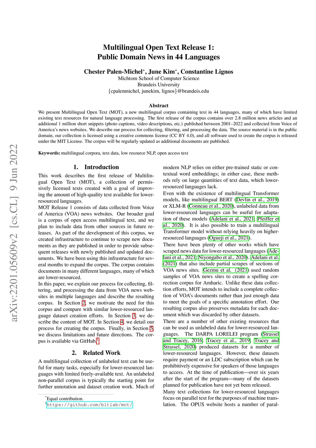 We present Multilingual Open Text (MOT), a new multilingual corpus containing text in 44 languages, many of which have limited existing text resources for natural language processing. The first release of the corpus contains over 2.8 million news articles and an additional 1 million short snippets (photo captions, video descriptions, etc.) published between 2001--2022 and collected from Voice of America's news websites. We describe our process for collecting, filtering, and processing the data. The source material is in the public domain, our collection is licensed using a creative commons license (CC BY 4.0), and all software used to create the corpus is released under the MIT License. The corpus will be regularly updated as additional documents are published.