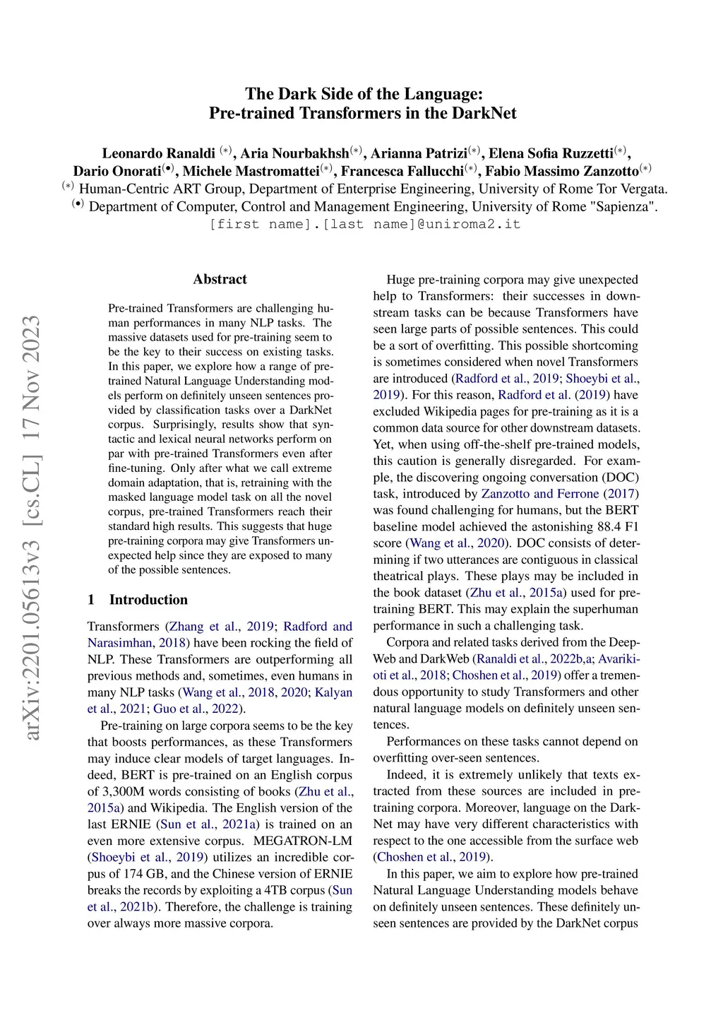 Pre-trained Transformers are challenging human performances in many NLP tasks. The massive datasets used for pre-training seem to be the key to their success on existing tasks. In this paper, we explore how a range of pre-trained Natural Language Understanding models perform on definitely unseen sentences provided by classification tasks over a DarkNet corpus. Surprisingly, results show that syntactic and lexical neural networks perform on par with pre-trained Transformers even after fine-tuning. Only after what we call extreme domain adaptation, that is, retraining with the masked language model task on all the novel corpus, pre-trained Transformers reach their standard high results. This suggests that huge pre-training corpora may give Transformers unexpected help since they are exposed to many of the possible sentences.