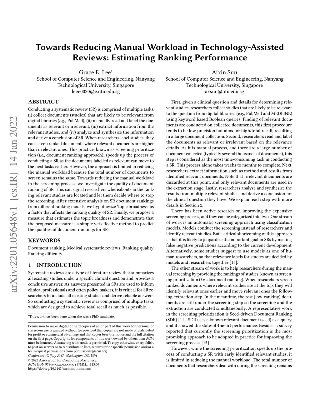 Conducting a systematic review (SR) is comprised of multiple tasks: (i) collect documents (studies) that are likely to be relevant from digital libraries (eg., PubMed), (ii) manually read and label the documents as relevant or irrelevant, (iii) extract information from the relevant studies, and (iv) analyze and synthesize the information and derive a conclusion of SR. When researchers label studies, they can screen ranked documents where relevant documents are higher than irrelevant ones. This practice, known as screening prioritization (ie., document ranking approach), speeds up the process of conducting a SR as the documents labelled as relevant can move to the next tasks earlier. However, the approach is limited in reducing the manual workload because the total number of documents to screen remains the same. Towards reducing the manual workload in the screening process, we investigate the quality of document ranking of SR. This can signal researchers whereabouts in the ranking relevant studies are located and let them decide where to stop the screening. After extensive analysis on SR document rankings from different ranking models, we hypothesize 'topic broadness' as a factor that affects the ranking quality of SR. Finally, we propose a measure that estimates the topic broadness and demonstrate that the proposed measure is a simple yet effective method to predict the qualities of document rankings for SRs.