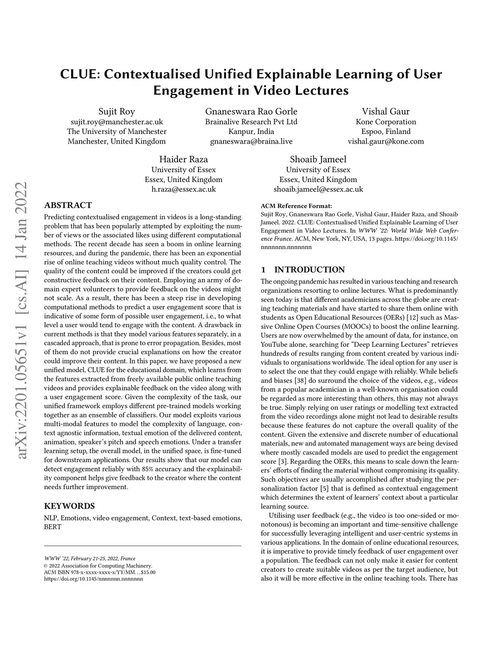 Predicting contextualised engagement in videos is a long-standing problem that has been popularly attempted by exploiting the number of views or the associated likes using different computational methods. The recent decade has seen a boom in online learning resources, and during the pandemic, there has been an exponential rise of online teaching videos without much quality control. The quality of the content could be improved if the creators could get constructive feedback on their content. Employing an army of domain expert volunteers to provide feedback on the videos might not scale. As a result, there has been a steep rise in developing computational methods to predict a user engagement score that is indicative of some form of possible user engagement, i.e., to what level a user would tend to engage with the content. A drawback in current methods is that they model various features separately, in a cascaded approach, that is prone to error propagation. Besides, most of them do not provide crucial explanations on how the creator could improve their content. In this paper, we have proposed a new unified model, CLUE for the educational domain, which learns from the features extracted from freely available public online teaching videos and provides explainable feedback on the video along with a user engagement score. Given the complexity of the task, our unified framework employs different pre-trained models working together as an ensemble of classifiers. Our model exploits various multi-modal features to model the complexity of language, context agnostic information, textual emotion of the delivered content, animation, speaker's pitch and speech emotions. Under a transfer learning setup, the overall model, in the unified space, is fine-tuned for downstream applications.