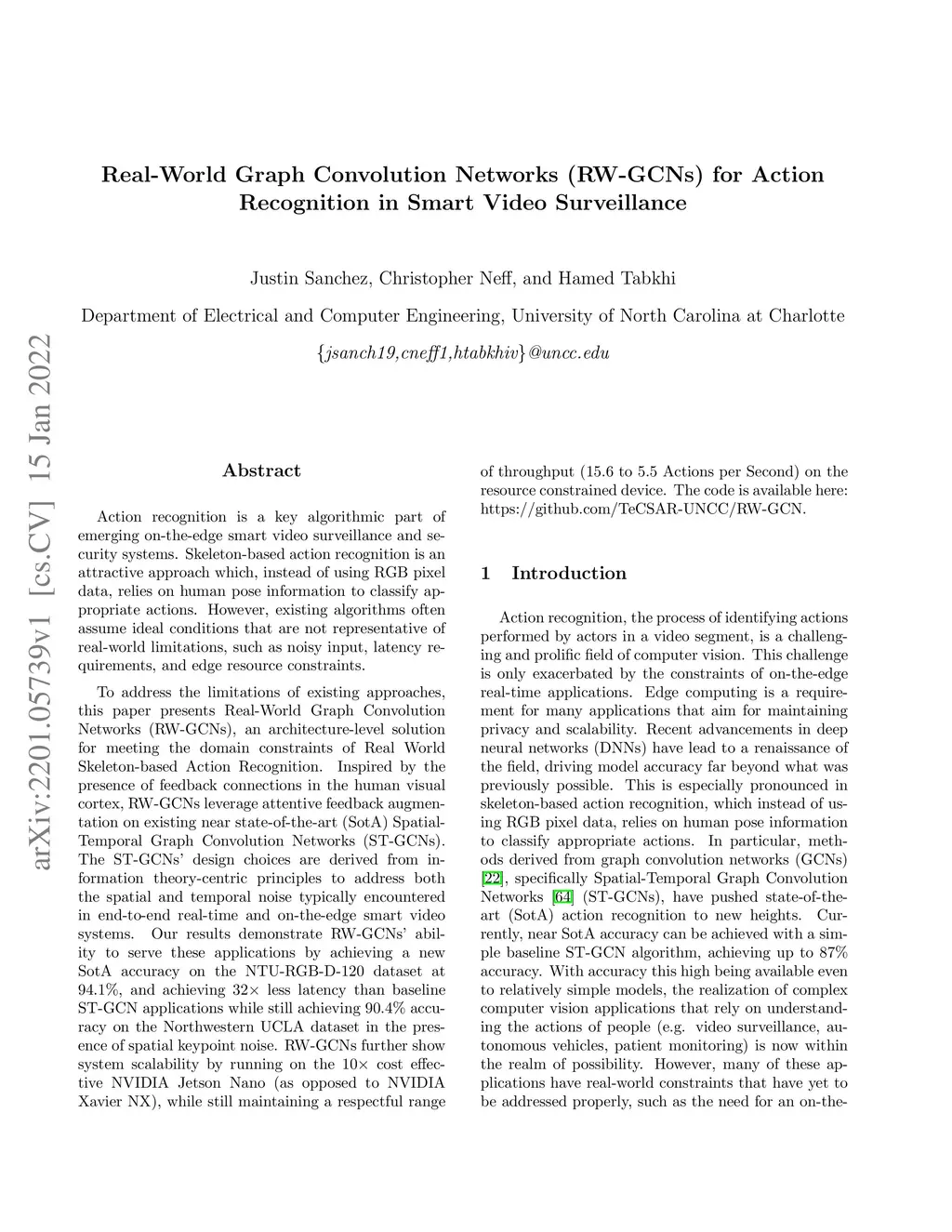 Action recognition is a key algorithmic part of emerging on-the-edge smart video surveillance and security systems. Skeleton-based action recognition is an attractive approach which, instead of using RGB pixel data, relies on human pose information to classify appropriate actions. However, existing algorithms often assume ideal conditions that are not representative of real-world limitations, such as noisy input, latency requirements, and edge resource constraints. To address the limitations of existing approaches, this paper presents Real-World Graph Convolution Networks (RW-GCNs), an architecture-level solution for meeting the domain constraints of Real World Skeleton-based Action Recognition. Inspired by the presence of feedback connections in the human visual cortex, RW-GCNs leverage attentive feedback augmentation on existing near state-of-the-art (SotA) Spatial-Temporal Graph Convolution Networks (ST-GCNs). The ST-GCNs' design choices are derived from information theory-centric principles to address both the spatial and temporal noise typically encountered in end-to-end real-time and on-the-edge smart video systems. Our results demonstrate RW-GCNs' ability to serve these applications by achieving a new SotA accuracy on the NTU-RGB-D-120 dataset at 94.1%, and achieving 32X less latency than baseline ST-GCN applications while still achieving 90.4% accuracy on the Northwestern UCLA dataset in the presence of spatial keypoint noise. RW-GCNs further show system scalability by running on the 10X cost effective NVIDIA Jetson Nano (as opposed to NVIDIA Xavier NX), while still maintaining a respectful range of throughput (15.6 to 5.5 Actions per Second) on the resource constrained device. The code is available here: https://github.com/TeCSAR-UNCC/RW-GCN.