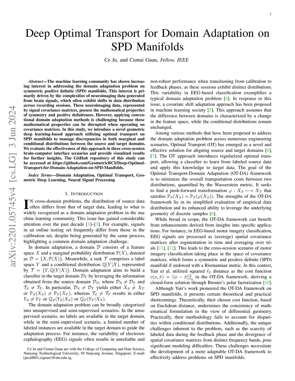Recent progress in geometric deep learning has drawn increasing attention from the machine learning community toward domain adaptation on symmetric positive definite (SPD) manifolds, especially for neuroimaging data that often suffer from distribution shifts across sessions. These data, typically represented as covariance matrices of brain signals, inherently lie on SPD manifolds due to their symmetry and positive definiteness. However, conventional domain adaptation methods often overlook this geometric structure when applied directly to covariance matrices, which can result in suboptimal performance. To address this issue, we introduce a new geometric deep learning framework that combines optimal transport theory with the geometry of SPD manifolds. Our approach aligns data distributions while respecting the manifold structure, effectively reducing both marginal and conditional discrepancies. We validate our method on three cross-session brain computer interface datasets, KU, BNCI2014001, and BNCI2015001, where it consistently outperforms baseline approaches while maintaining the intrinsic geometry of the data. We also provide quantitative results and visualizations to better illustrate the behavior of the learned embeddings.