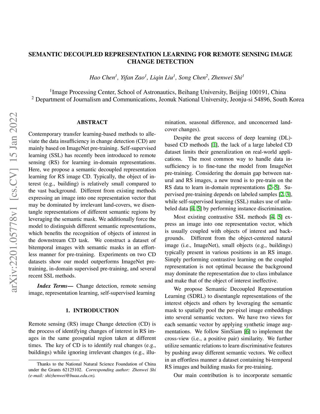 Contemporary transfer learning-based methods to alleviate the data insufficiency in change detection (CD) are mainly based on ImageNet pre-training. Self-supervised learning (SSL) has recently been introduced to remote sensing (RS) for learning in-domain representations. Here, we propose a semantic decoupled representation learning for RS image CD. Typically, the object of interest (e.g., building) is relatively small compared to the vast background. Different from existing methods expressing an image into one representation vector that may be dominated by irrelevant land-covers, we disentangle representations of different semantic regions by leveraging the semantic mask. We additionally force the model to distinguish different semantic representations, which benefits the recognition of objects of interest in the downstream CD task. We construct a dataset of bitemporal images with semantic masks in an effortless manner for pre-training. Experiments on two CD datasets show our model outperforms ImageNet pre-training, in-domain supervised pre-training, and several recent SSL methods.