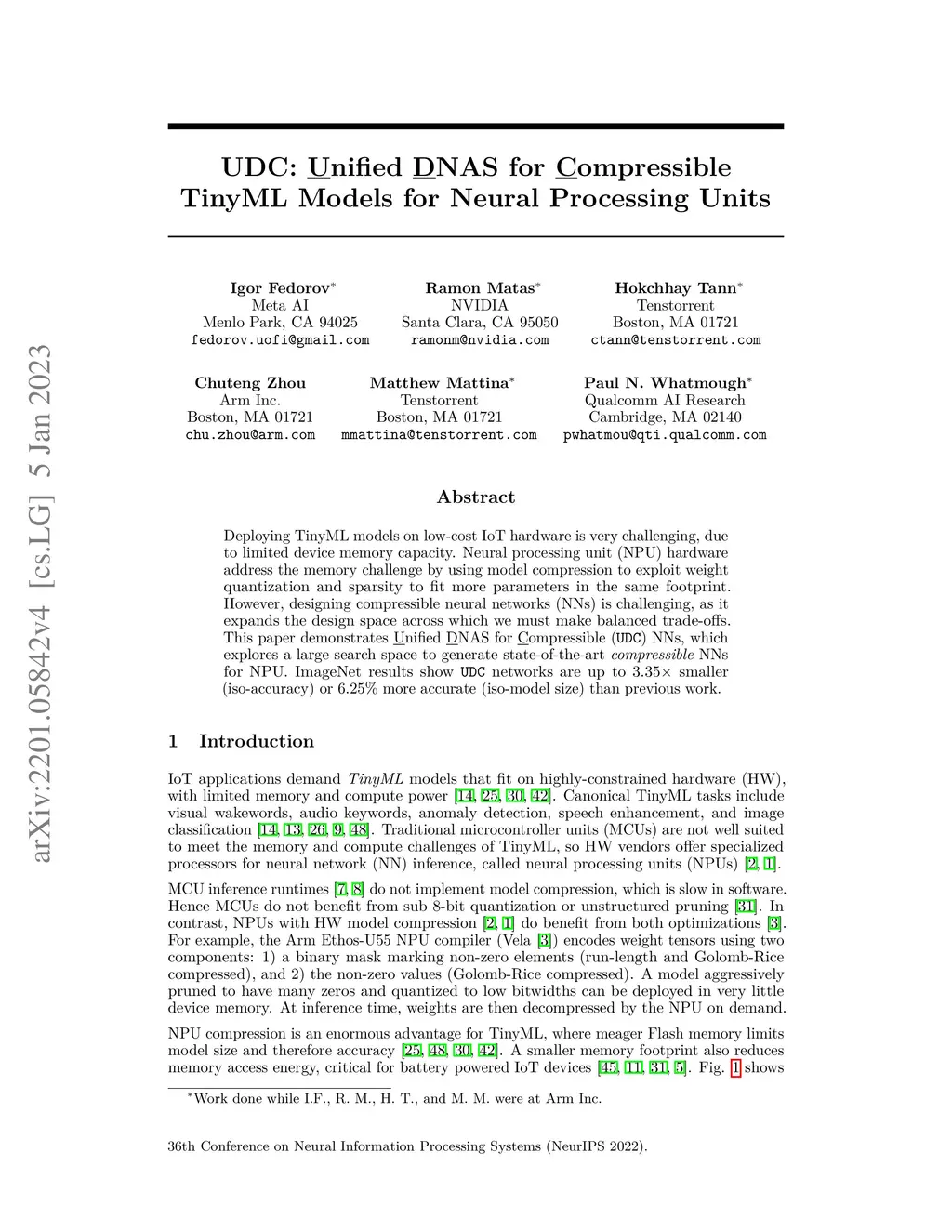 Deploying TinyML models on low-cost IoT hardware is very challenging, due to limited device memory capacity. Neural processing unit (NPU) hardware address the memory challenge by using model compression to exploit weight quantization and sparsity to fit more parameters in the same footprint. However, designing compressible neural networks (NNs) is challenging, as it expands the design space across which we must make balanced trade-offs. This paper demonstrates Unified DNAS for Compressible (UDC) NNs, which explores a large search space to generate state-of-the-art compressible NNs for NPU. ImageNet results show UDC networks are up to smaller (iso-accuracy) or 6.25% more accurate (iso-model size) than previous work.