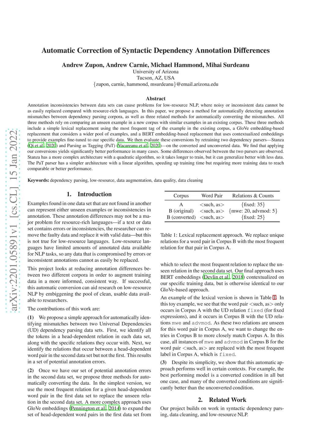 Annotation inconsistencies between data sets can cause problems for low-resource NLP, where noisy or inconsistent data cannot be as easily replaced compared with resource-rich languages. In this paper, we propose a method for automatically detecting annotation mismatches between dependency parsing corpora, as well as three related methods for automatically converting the mismatches. All three methods rely on comparing an unseen example in a new corpus with similar examples in an existing corpus. These three methods include a simple lexical replacement using the most frequent tag of the example in the existing corpus, a GloVe embedding-based replacement that considers a wider pool of examples, and a BERT embedding-based replacement that uses contextualized embeddings to provide examples fine-tuned to our specific data. We then evaluate these conversions by retraining two dependency parsers -- Stanza (Qi et al. 2020) and Parsing as Tagging (PaT) (Vacareanu et al. 2020) -- on the converted and unconverted data. We find that applying our conversions yields significantly better performance in many cases. Some differences observed between the two parsers are observed. Stanza has a more complex architecture with a quadratic algorithm, so it takes longer to train, but it can generalize better with less data. The PaT parser has a simpler architecture with a linear algorithm, speeding up training time but requiring more training data to reach comparable or better performance.