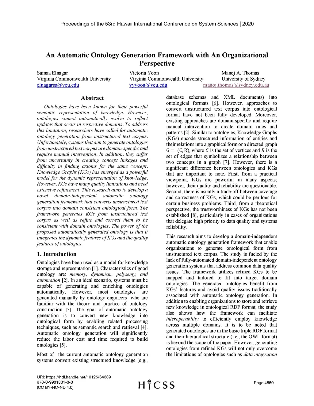 Ontologies have been known for their semantic representation of knowledge. ontologies cannot automatically evolve to reflect updates that occur in respective domains. To address this limitation, researchers have called for automatic ontology generation from unstructured text corpus. Unfortunately, systems that aim to generate ontologies from unstructured text corpus are domain-specific and require manual intervention. In addition, they suffer from uncertainty in creating concept linkages and difficulty in finding axioms for the same concept. Knowledge Graphs (KGs) has emerged as a powerful model for the dynamic representation of knowledge. However, KGs have many quality limitations and need extensive refinement. This research aims to develop a novel domain-independent automatic ontology generation framework that converts unstructured text corpus into domain consistent ontological form. The framework generates KGs from unstructured text corpus as well as refine and correct them to be consistent with domain ontologies. The power of the proposed automatically generated ontology is that it integrates the dynamic features of KGs and the quality features of ontologies.