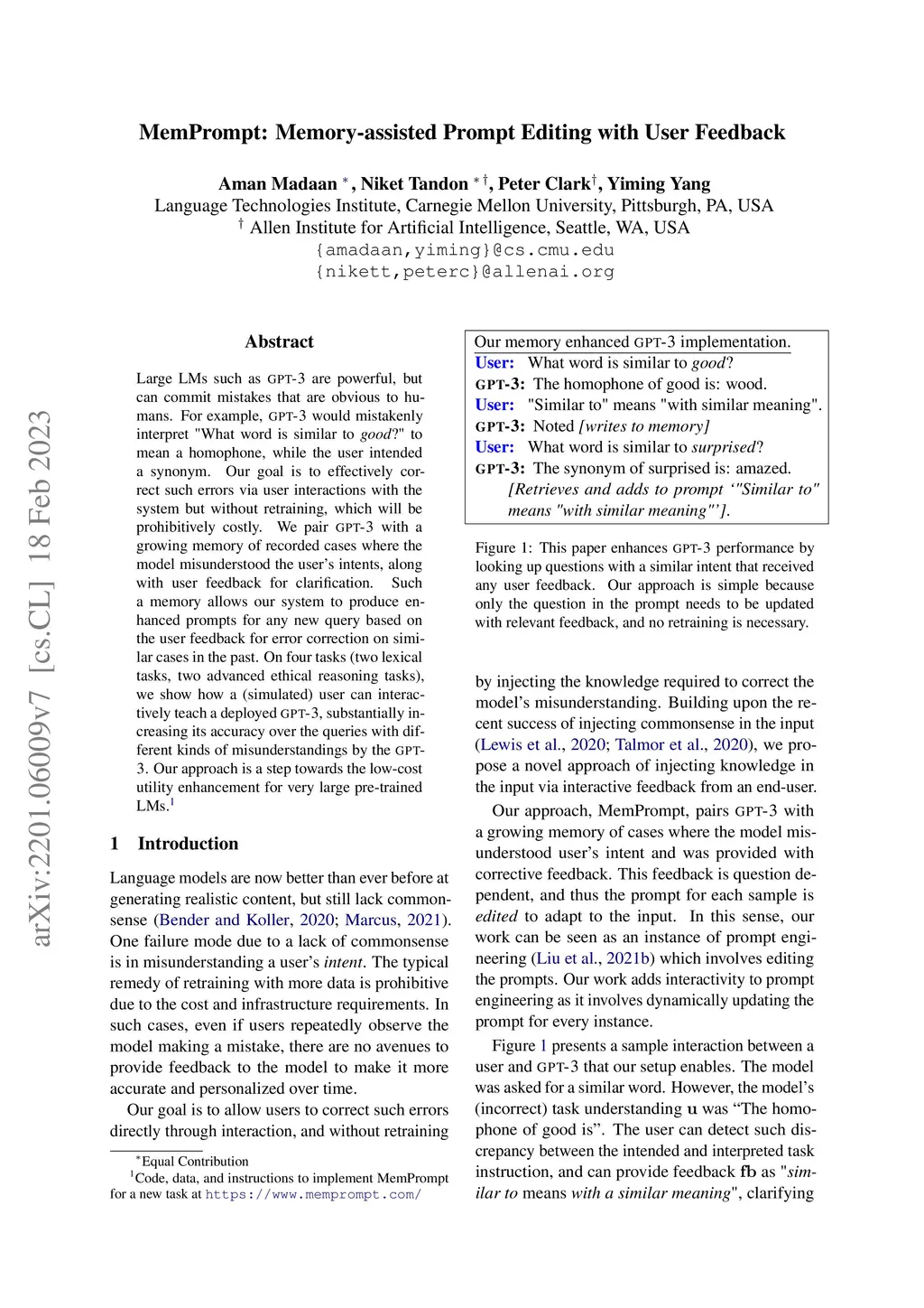 Memory-assisted prompt editing to improve GPT-3 after deployment