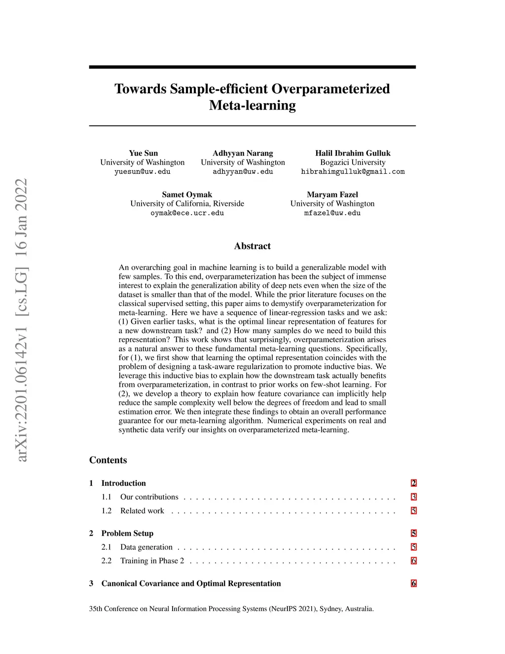 An overarching goal in machine learning is to build a generalizable model with few samples. To this end, overparameterization has been the subject of immense interest to explain the generalization ability of deep nets even when the size of the dataset is smaller than that of the model. While the prior literature focuses on the classical supervised setting, this paper aims to demystify overparameterization for meta-learning. Here we have a sequence of linear-regression tasks and we ask: (1) Given earlier tasks, what is the optimal linear representation of features for a new downstream task? and (2) How many samples do we need to build this representation? This work shows that surprisingly, overparameterization arises as a natural answer to these fundamental meta-learning questions. Specifically, for (1), we first show that learning the optimal representation coincides with the problem of designing a task-aware regularization to promote inductive bias. We leverage this inductive bias to explain how the downstream task actually benefits from overparameterization, in contrast to prior works on few-shot learning. For (2), we develop a theory to explain how feature covariance can implicitly help reduce the sample complexity well below the degrees of freedom and lead to small estimation error. We then integrate these findings to obtain an overall performance guarantee for our meta-learning algorithm. Numerical experiments on real and synthetic data verify our insights on overparameterized meta-learning.