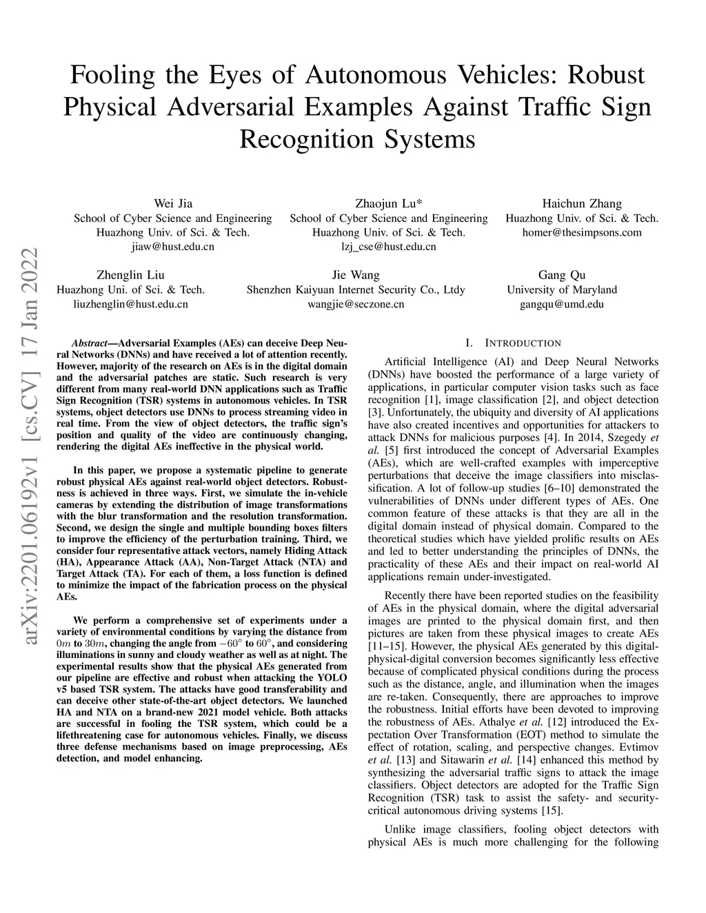 Adversarial Examples (AEs) can deceive Deep Neural Networks (DNNs) and have received a lot of attention recently. However, majority of the research on AEs is in the digital domain and the adversarial patches are static, which is very different from many real-world DNN applications such as Traffic Sign Recognition (TSR) systems in autonomous vehicles. In TSR systems, object detectors use DNNs to process streaming video in real time. From the view of object detectors, the traffic sign`s position and quality of the video are continuously changing, rendering the digital AEs ineffective in the physical world. In this paper, we propose a systematic pipeline to generate robust physical AEs against real-world object detectors. Robustness is achieved in three ways. First, we simulate the in-vehicle cameras by extending the distribution of image transformations with the blur transformation and the resolution transformation. Second, we design the single and multiple bounding boxes filters to improve the efficiency of the perturbation training. Third, we consider four representative attack vectors, namely Hiding Attack, Appearance Attack, Non-Target Attack and Target Attack. We perform a comprehensive set of experiments under a variety of environmental conditions, and considering illuminations in sunny and cloudy weather as well as at night. The experimental results show that the physical AEs generated from our pipeline are effective and robust when attacking the YOLO v5 based TSR system. The attacks have good transferability and can deceive other state-of-the-art object detectors. We launched HA and NTA on a brand-new 2021 model vehicle. Both attacks are successful in fooling the TSR system, which could be a life-threatening case for autonomous vehicles. Finally, we discuss three defense mechanisms based on image preprocessing, AEs detection, and model enhancing.